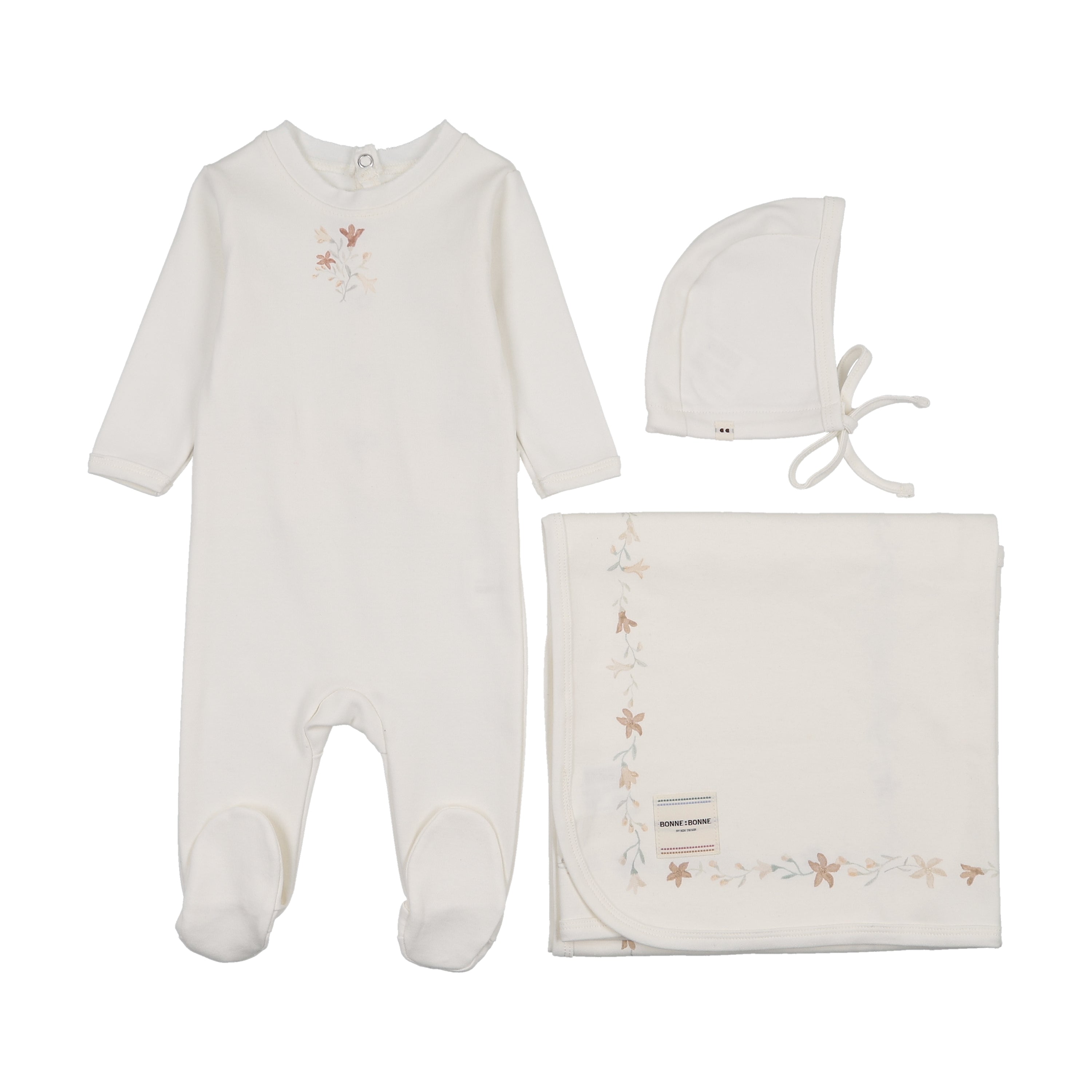 Cozy cotton footie featuring a charming floral print on the chest, bringing a whimsical, nature-inspired touch to your little one’s wardrobe. The coordinating blanket, with a border of flowers and blooms, completes the set with a sweet, floral vibe.