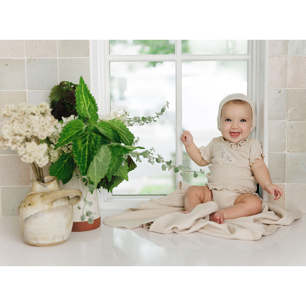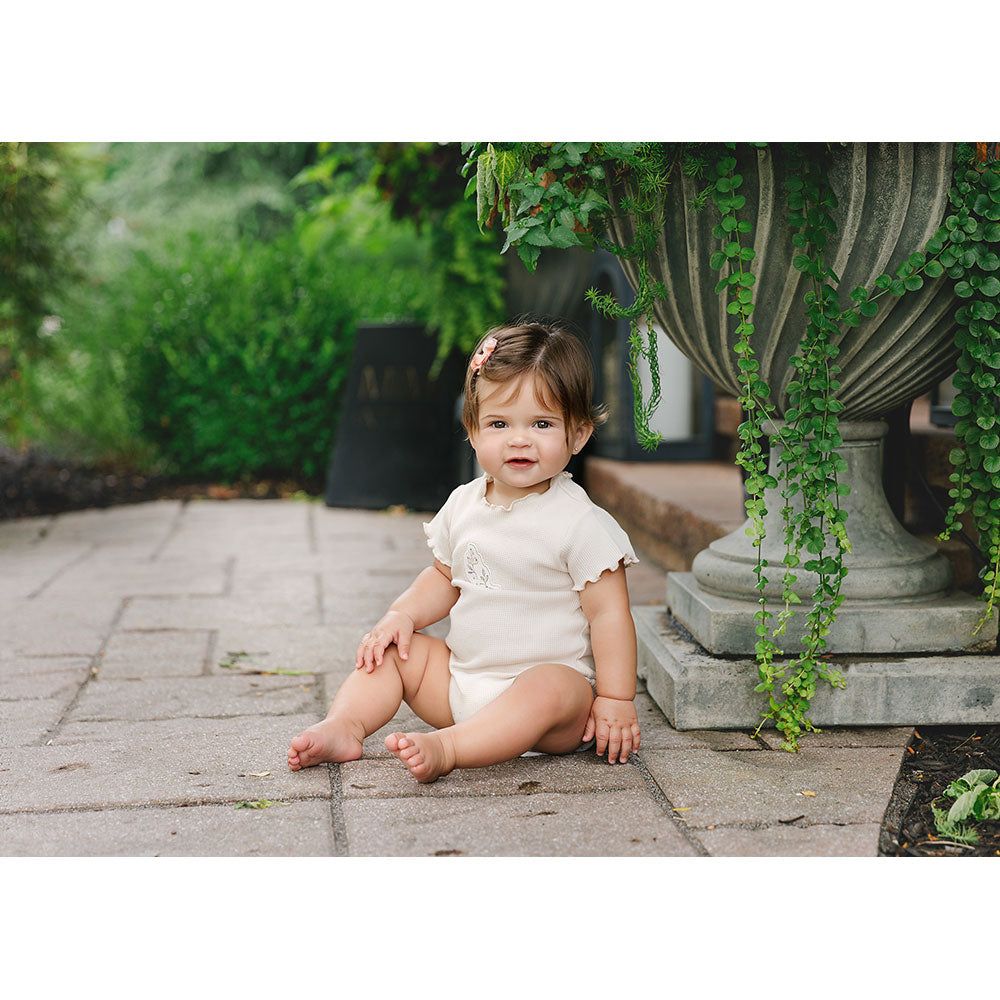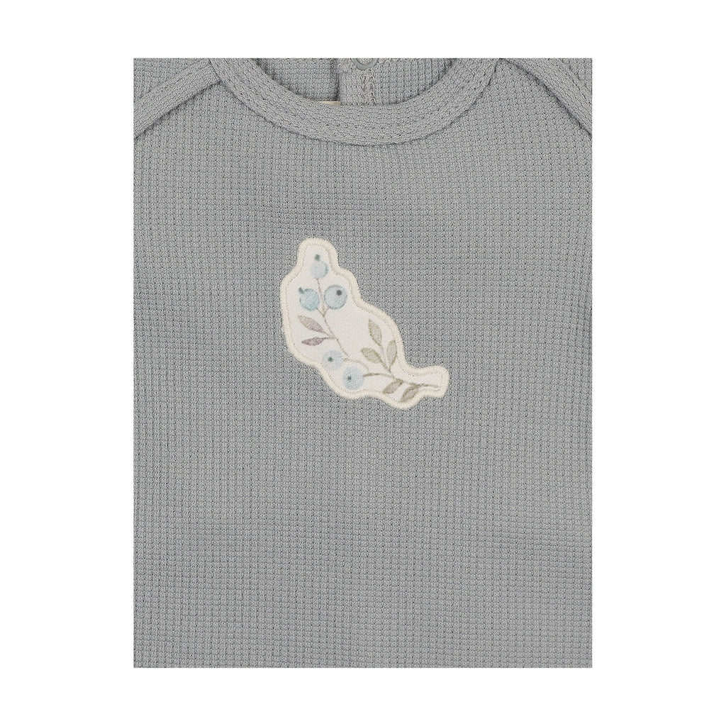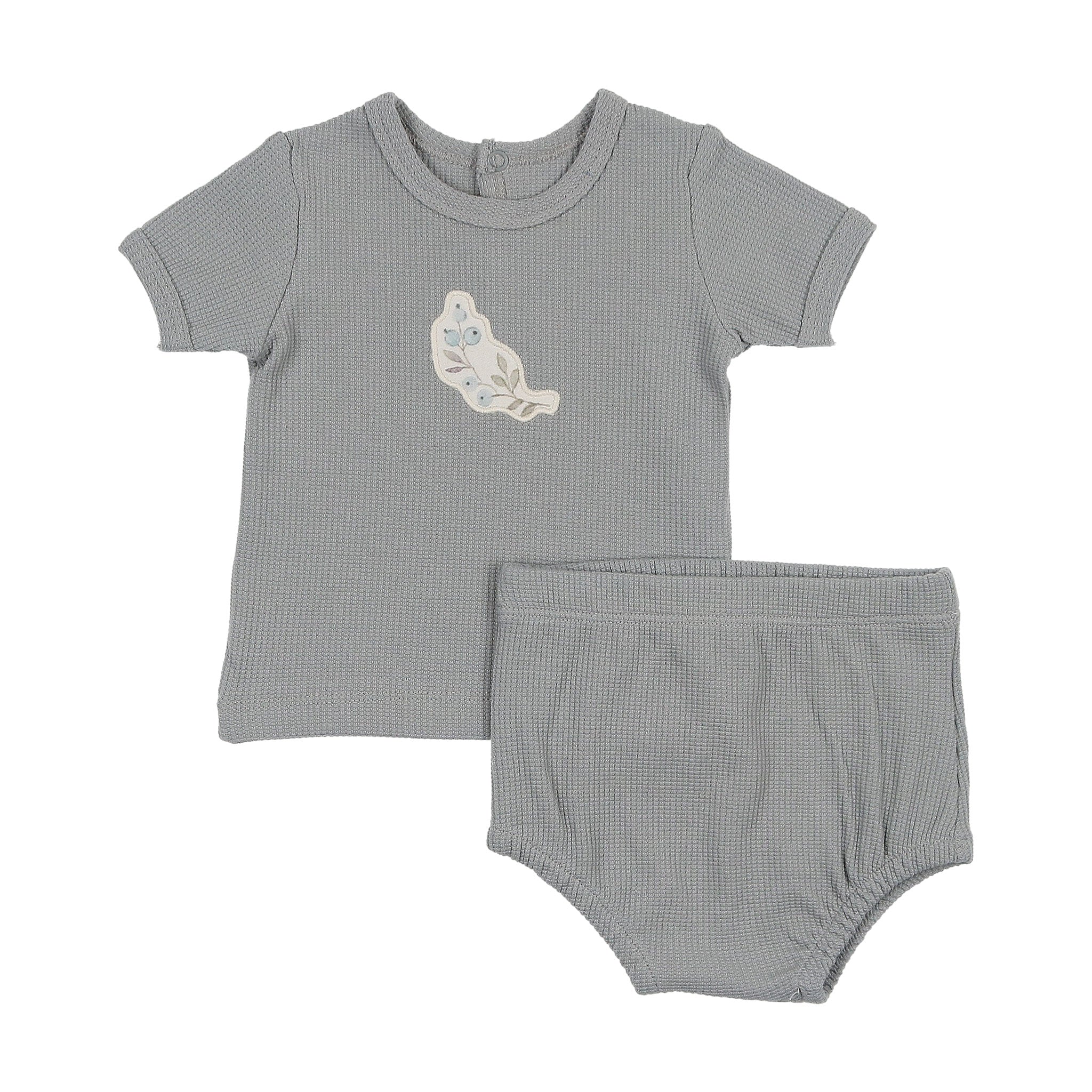 The delicately tinted waffle fabric of this ensemble is enhanced by the cheerful applique at the center of the chest. A perfect summer outfit for soft-skinned, fresh faced infants.