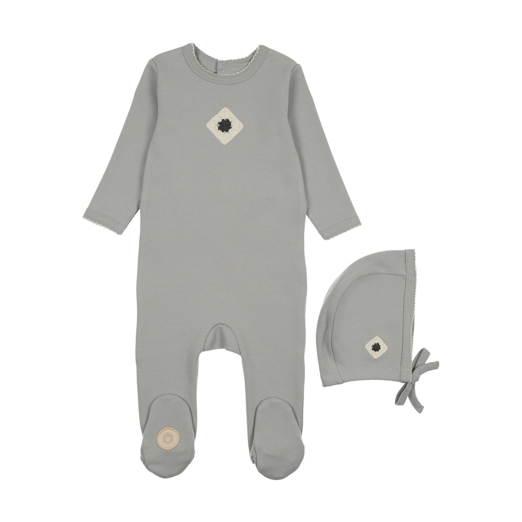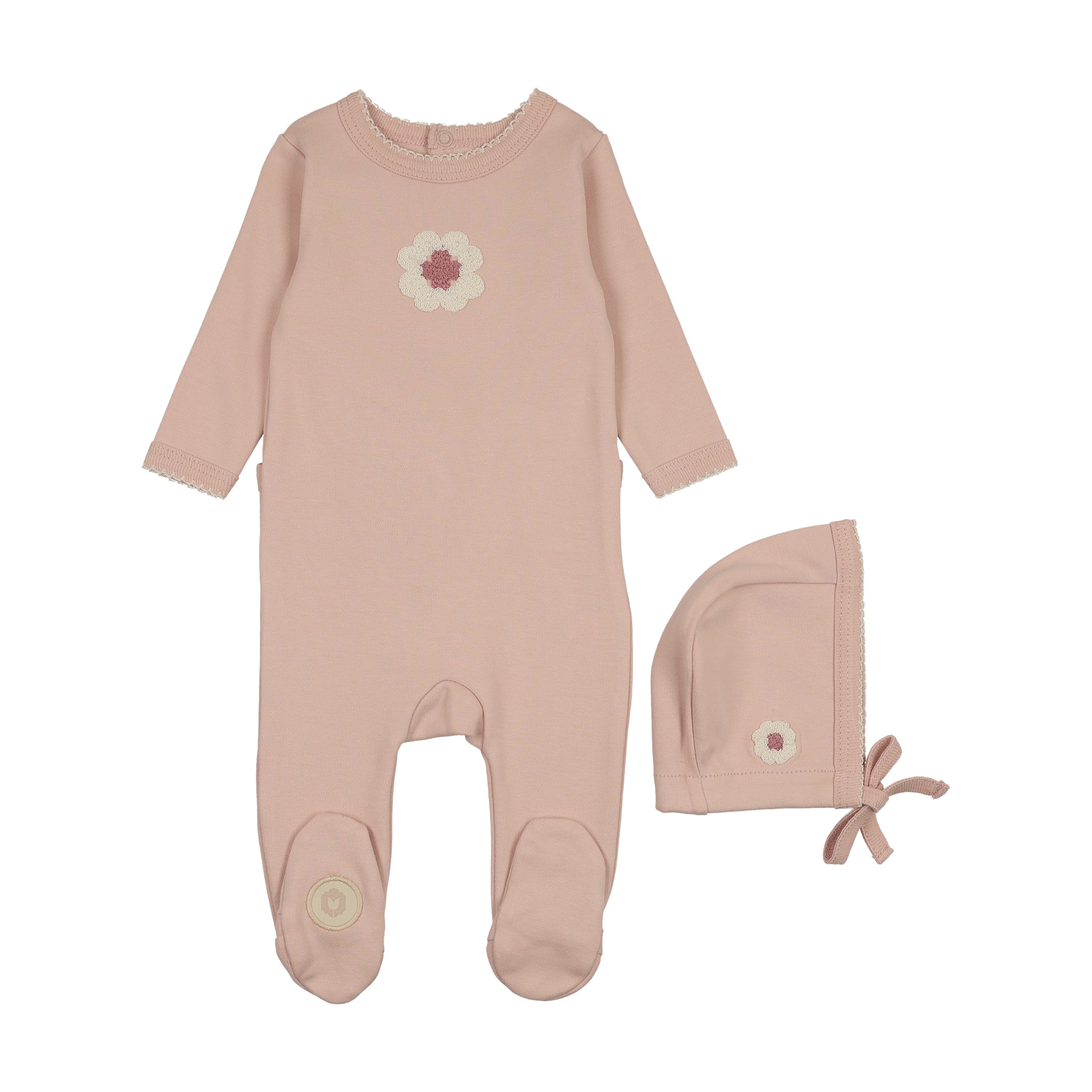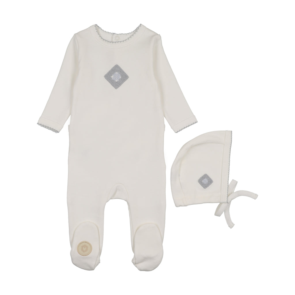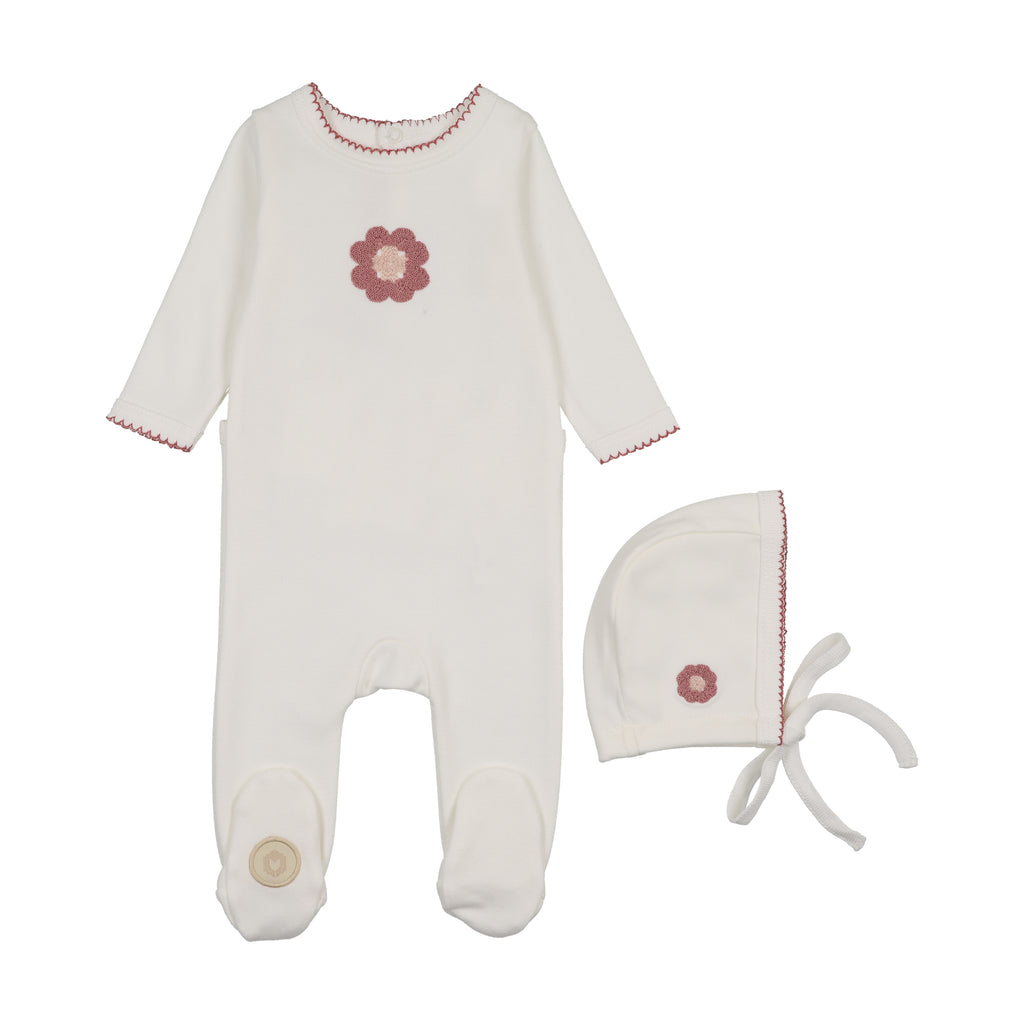 Do well in geometry this season. This uniquely blissful cotton footie is adorned with a charming knit flower and geometric shape appliqué. on the chest, here is a modern twist on timeless design. Paired with a beautifully coordinating hat.