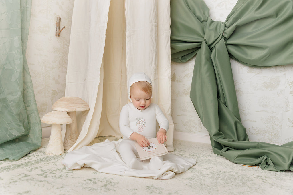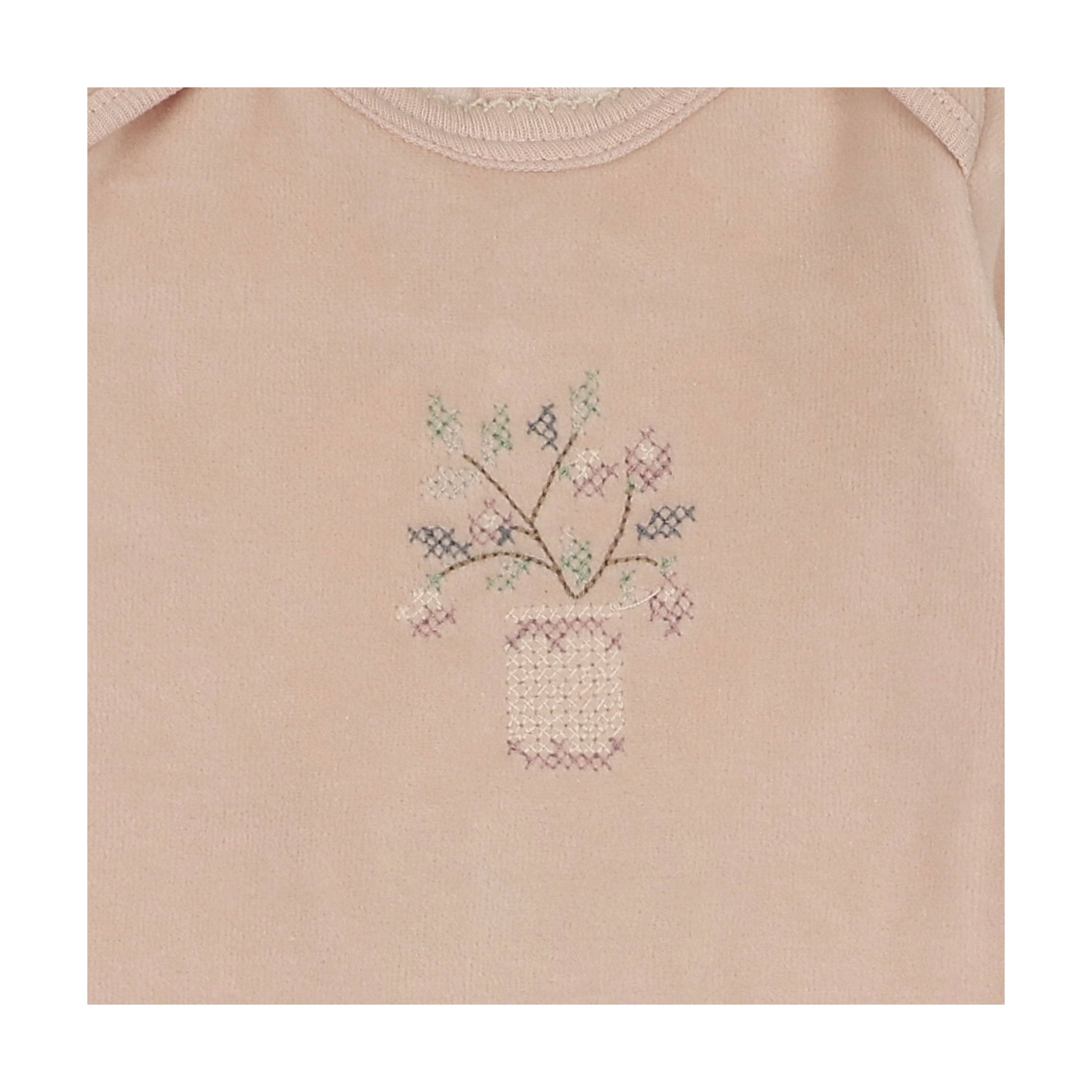 Intricate cross-stitch embroidery of a vase filled with blossoms and leaves on the chest, blending elegance with a touch of nature. The matching hat ties the set together beautifully. Scalloped trim edges it all with delightful detail.