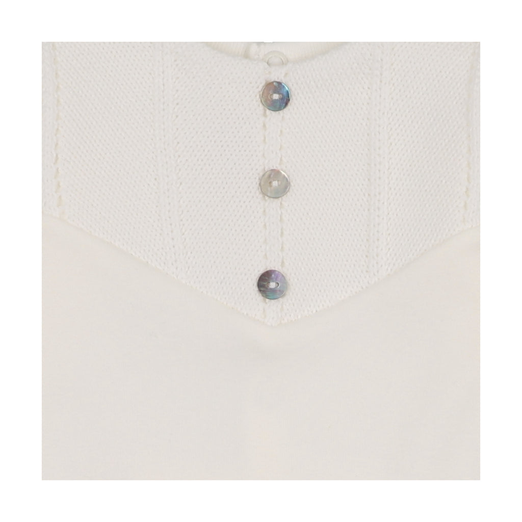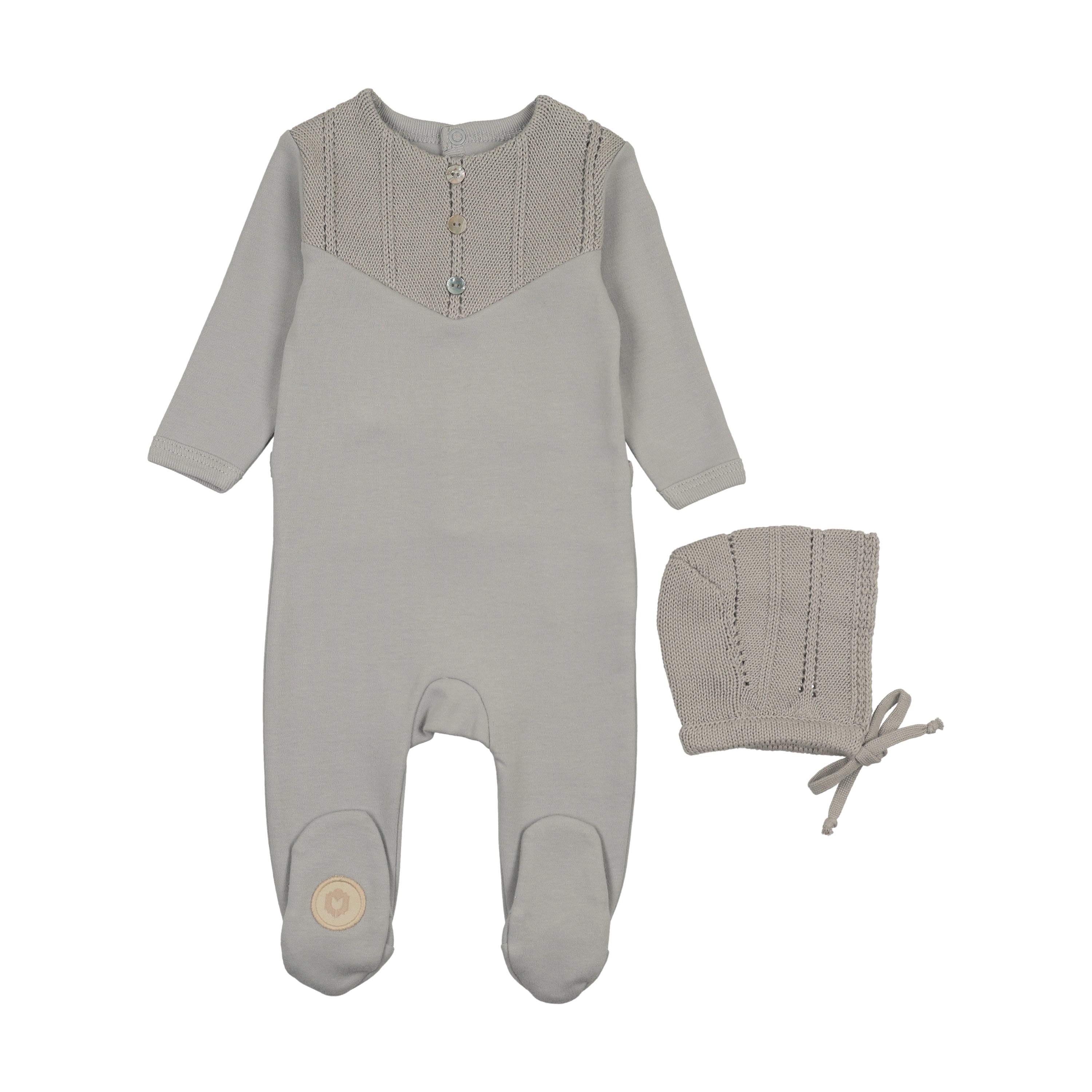 Soft, snuggable cotton with a ribbed knit overlay in a sleek V-shape, creating a stylish bib effect. The Henley-style design with three buttons down the neck adds a touch of classic charm. Paired with a matching knit hat and a blanket with knit detailing on the edge.