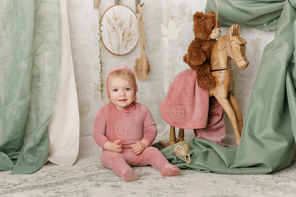 Effortless style comes in the shape of this ribbed velour footie, featuring an embossed MT emblem on the chest for a touch of timeless charm. A matching jacket + blanket complete the look, offering cozy coordination.