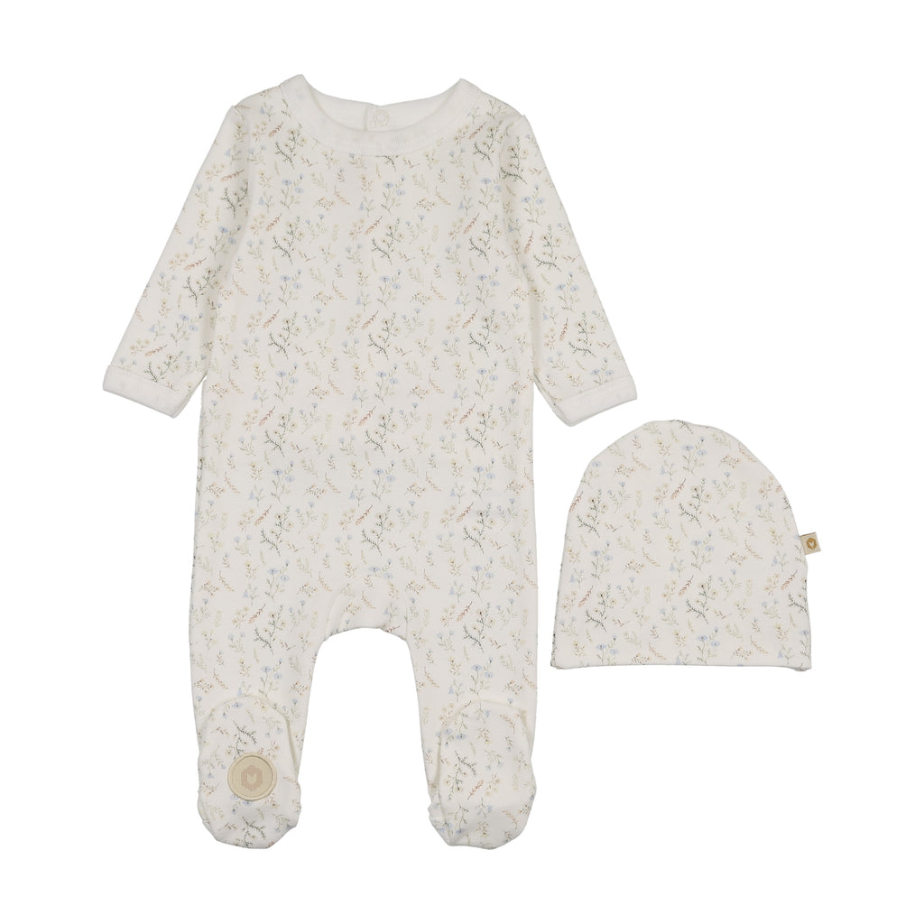 Fully floral footie in brushed cotton? Yes, please! Vibrant-yet-tiny blooms cover the entire footie, creating a cozy, eye-catching look. Paired with a matching floral hat and blanket, this set is as sweet as it is snuggly.
