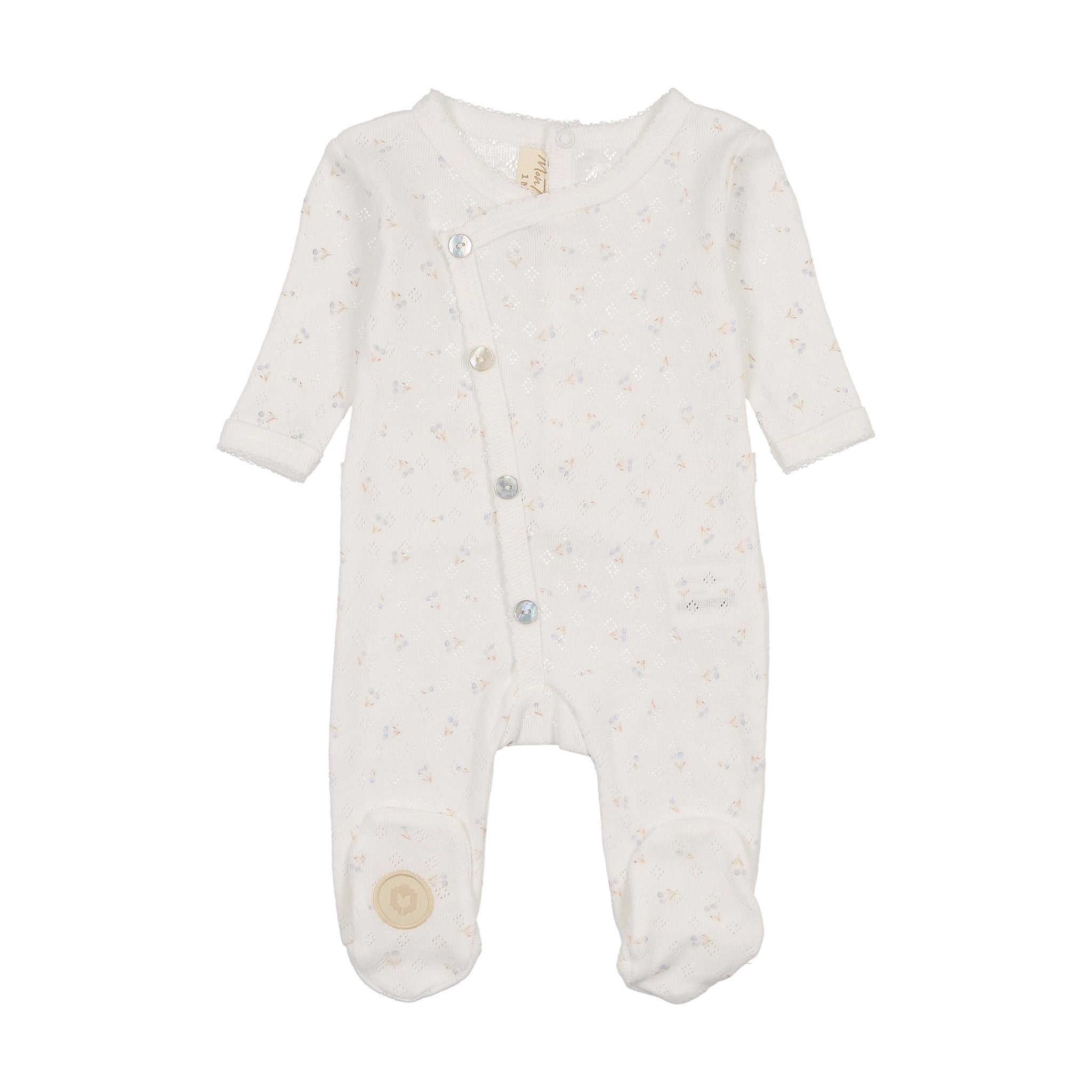 Crafted with lightweight pointelle cotton, this cozy wrap footie is scattered with a delicate berry print. A thin ribbon trim and decorative buttons add the perfect finishing touches.
