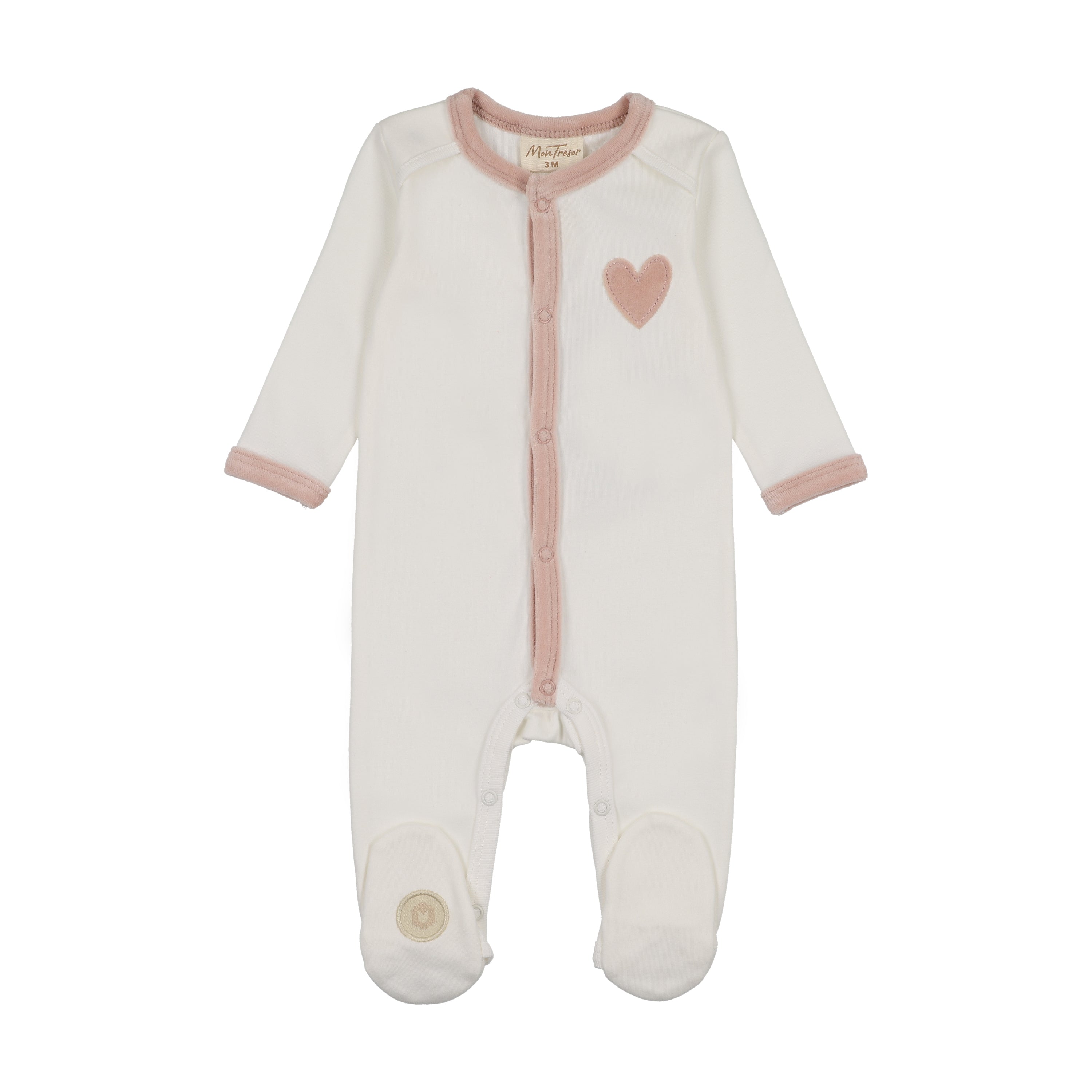 Wrap your little one in the softest cotton with this adorable footie, featuring velour trims for a touch of extra coziness. A velour heart applique adds a dash of love, while the front closure makes it easy to slip on and off.