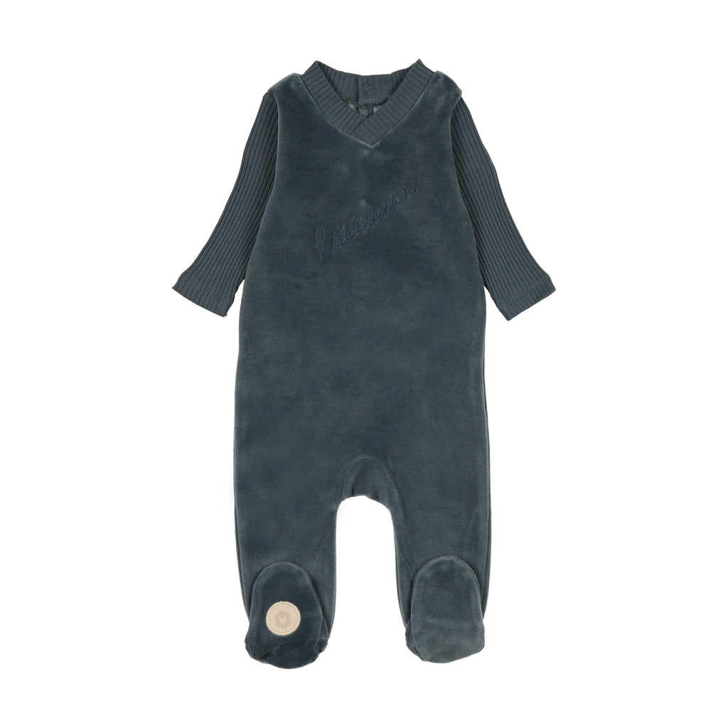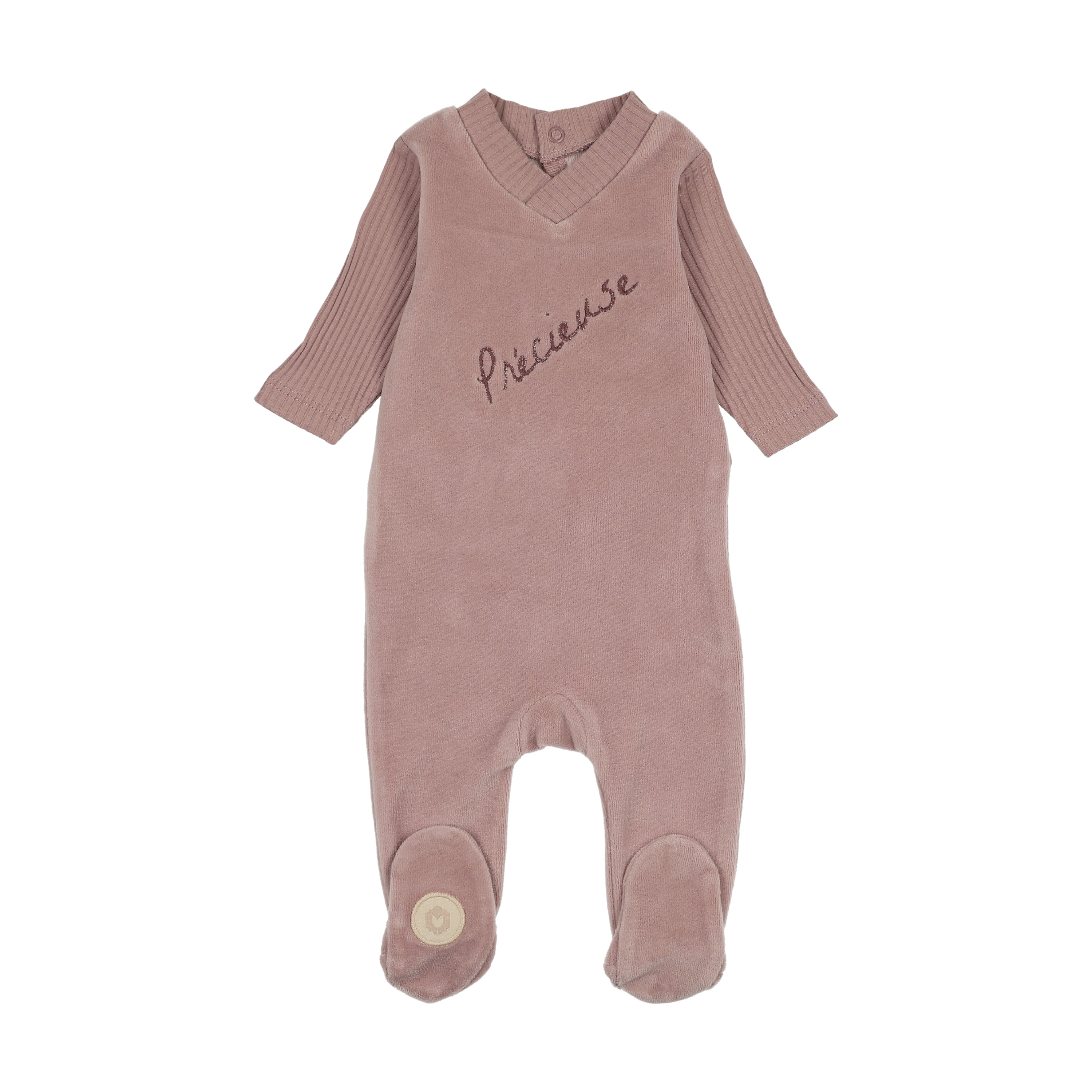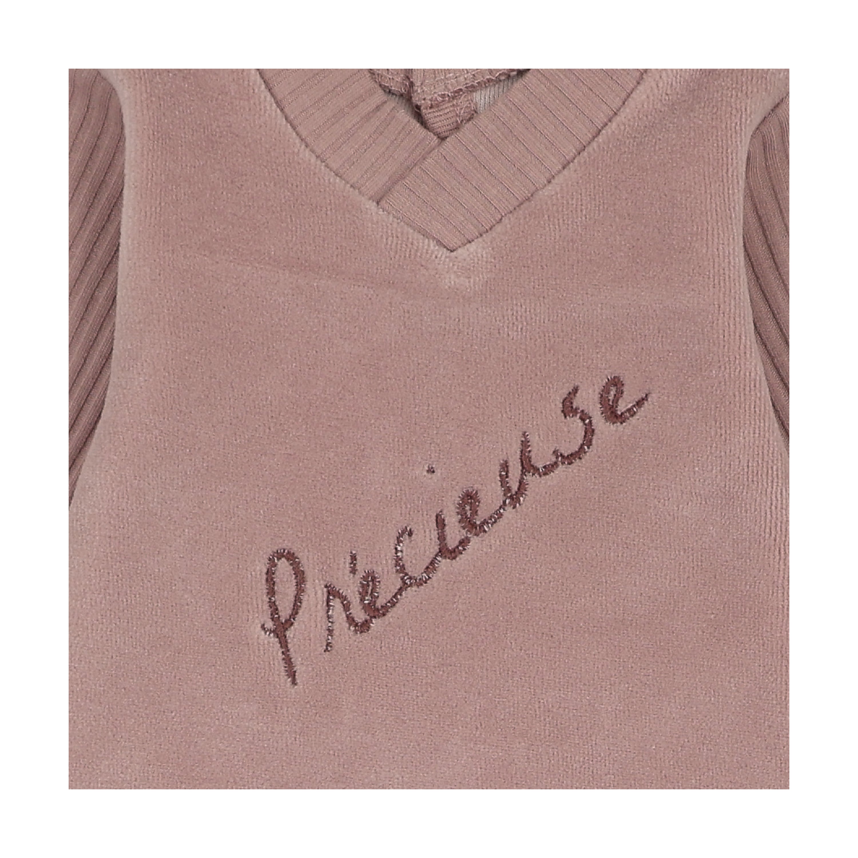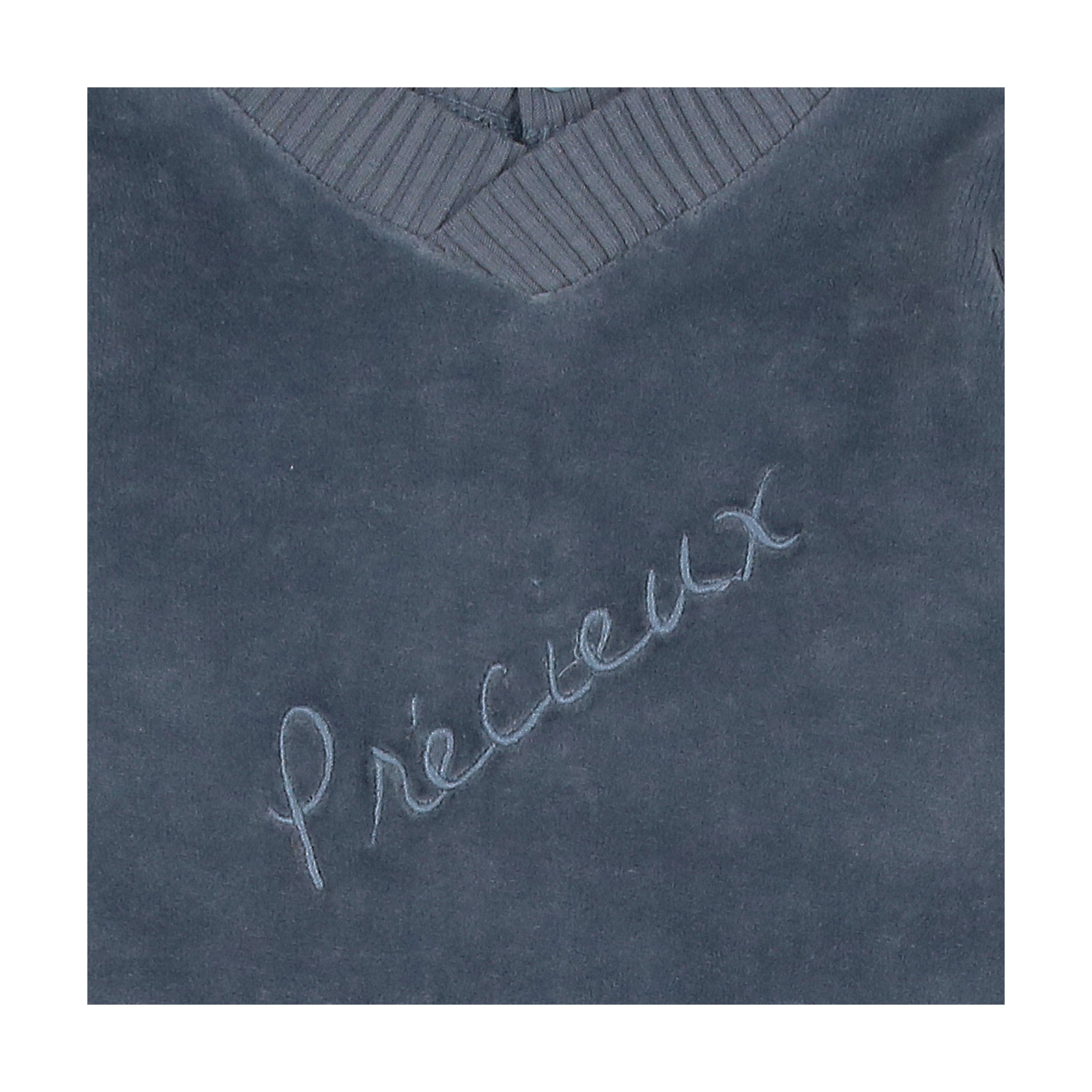 Soft. Stylish. Features ribbed sleeves and a ribbed V-neck trim. The word (precious) is delicately embroidered on the chest, adding a sweet and meaningful detail to this timeless piece. Perfect for the most precious people in your life.