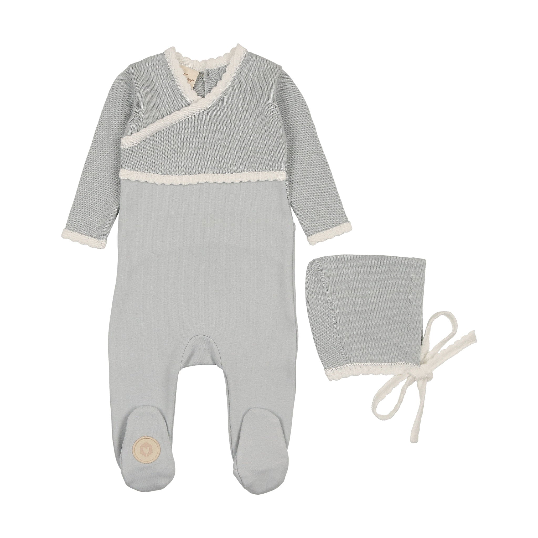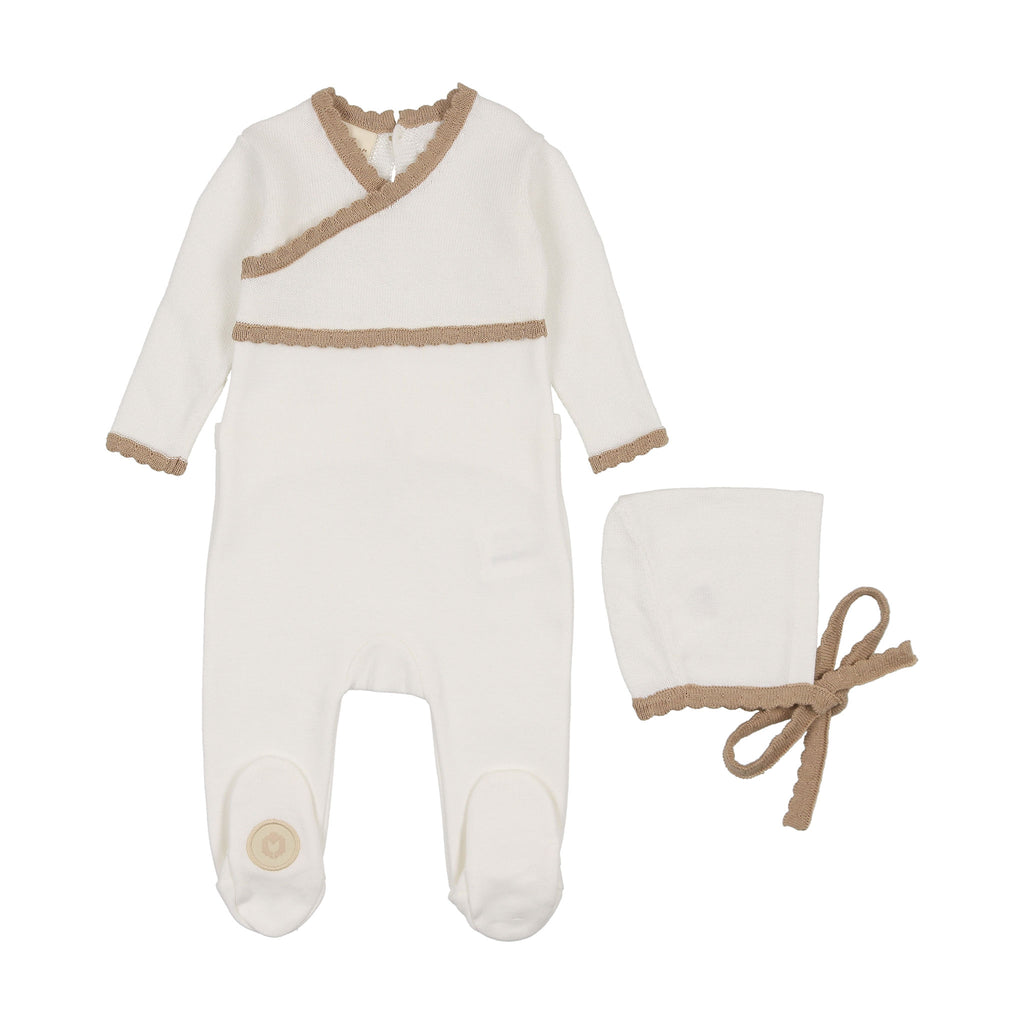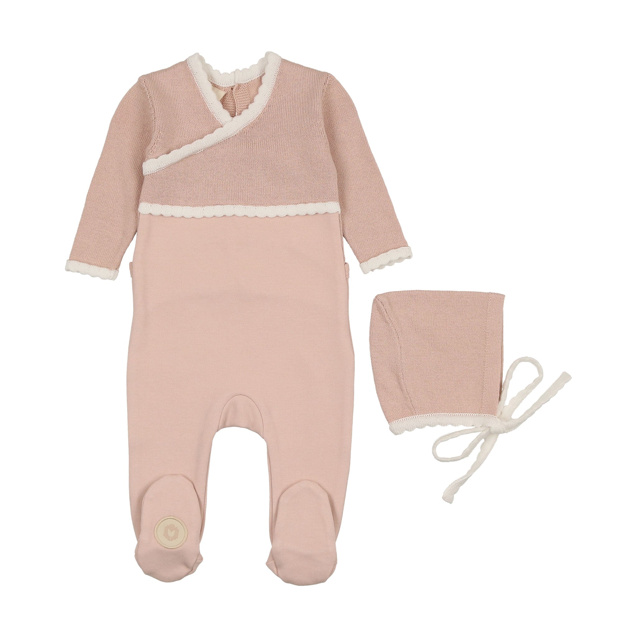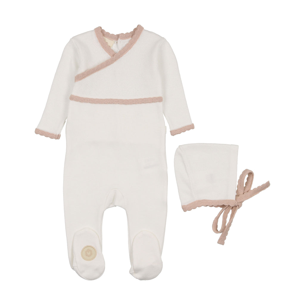 This delicately colored combined knit wrap footie and hat set is woven from premium knit, the perfect packaging for sensitive baby skin.