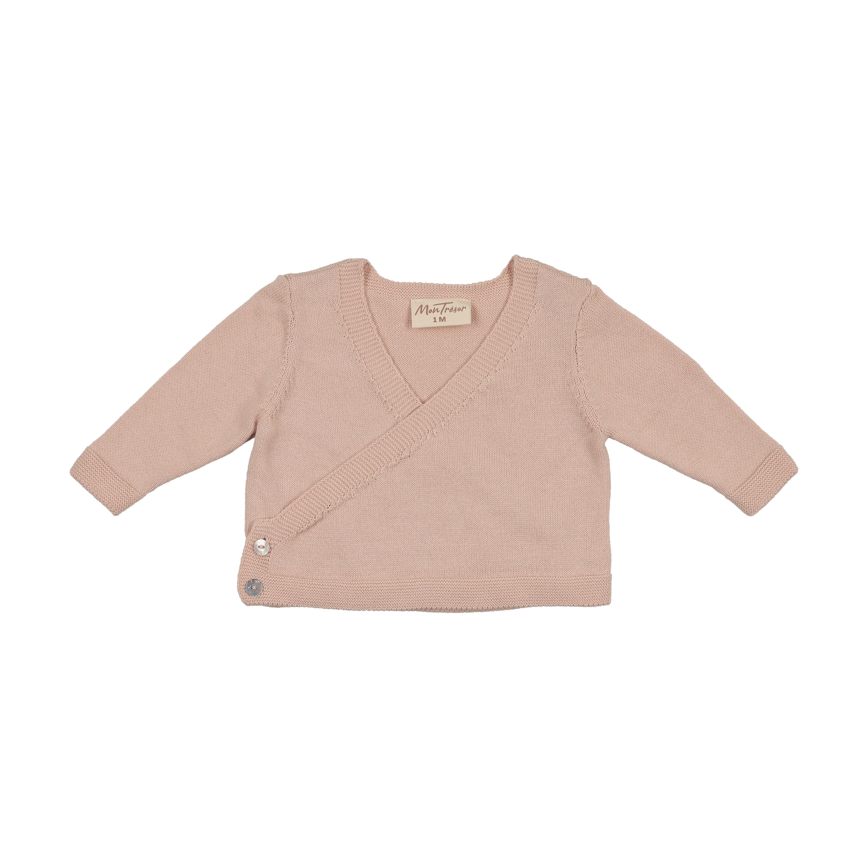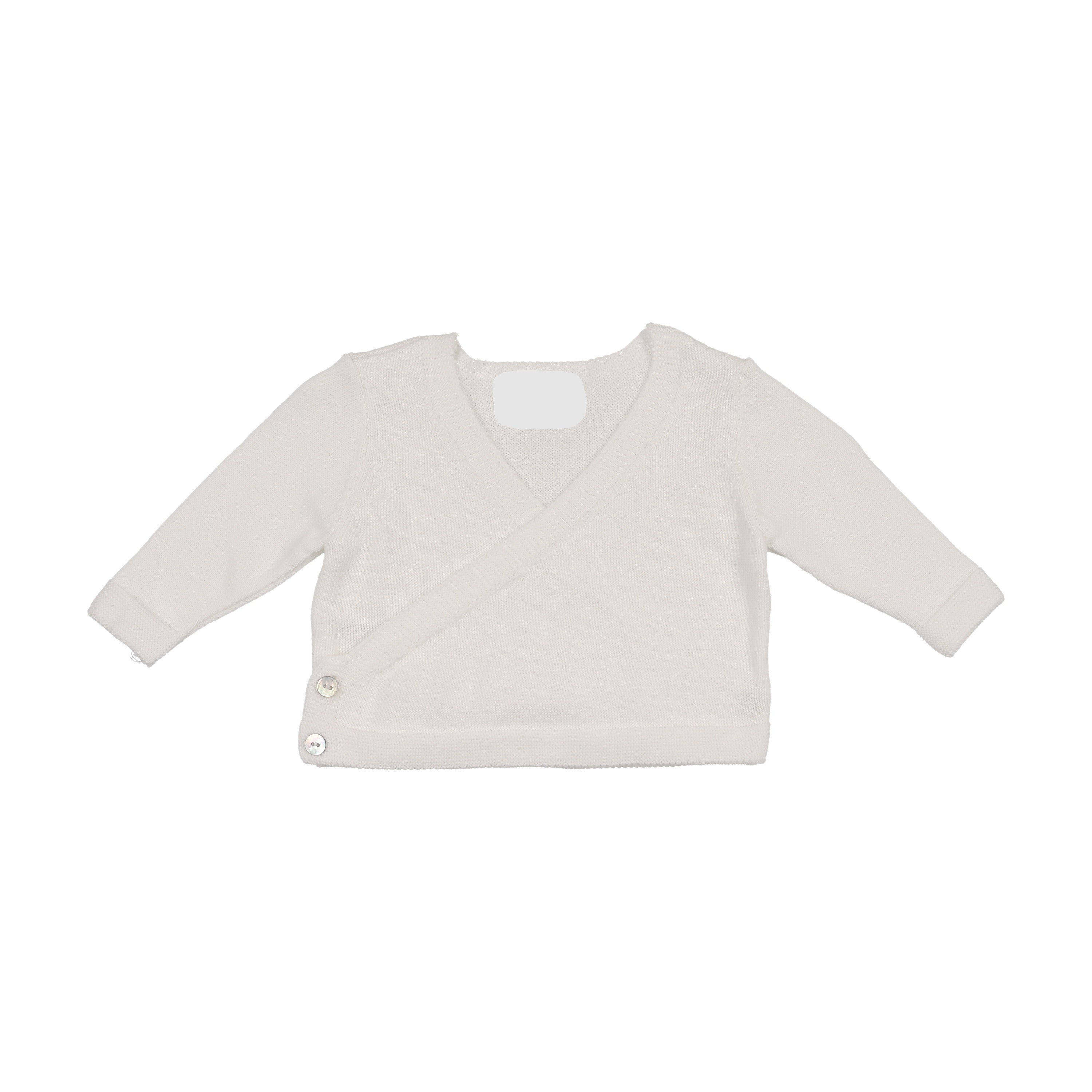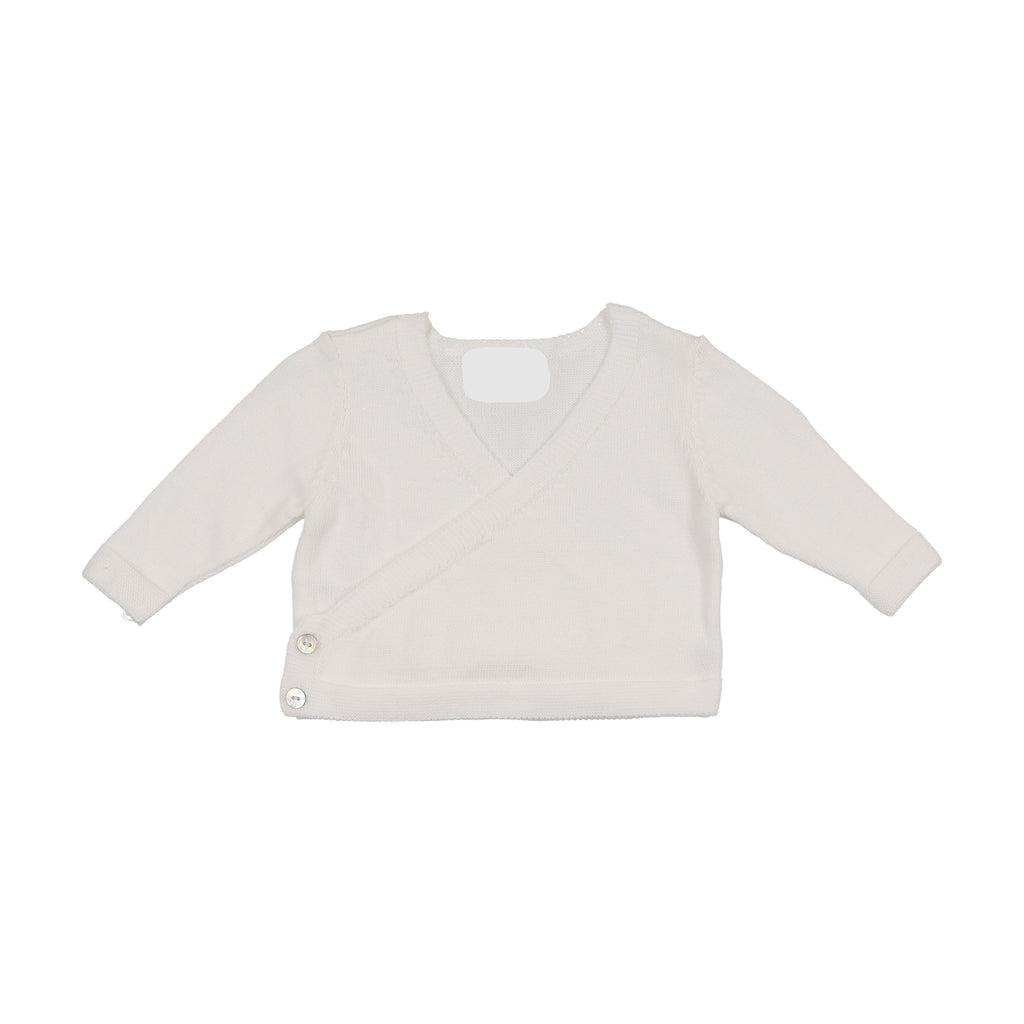 A delicate knit wrap cardigan overlay creates a layered look that's both stylish and cozy. Tiny flower or shrub embroidery on the chest peeks out when the cardigan is worn. The same charming embroidery appears on the matching hat and blanket, tying the whole set together in a beautiful, coordinated way