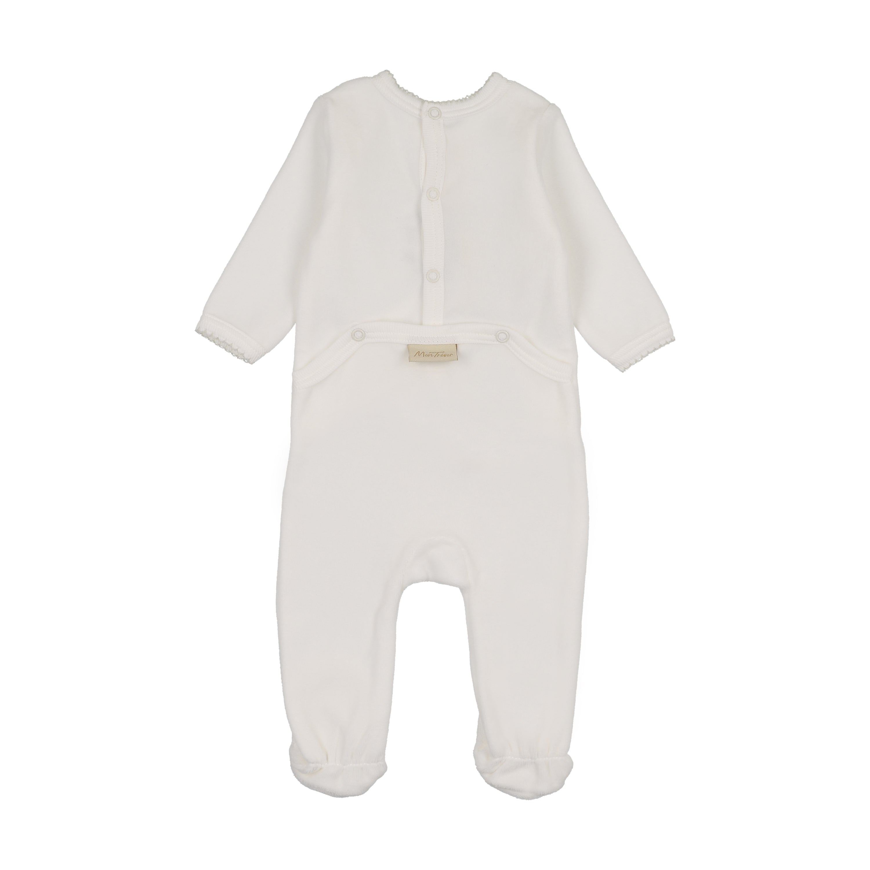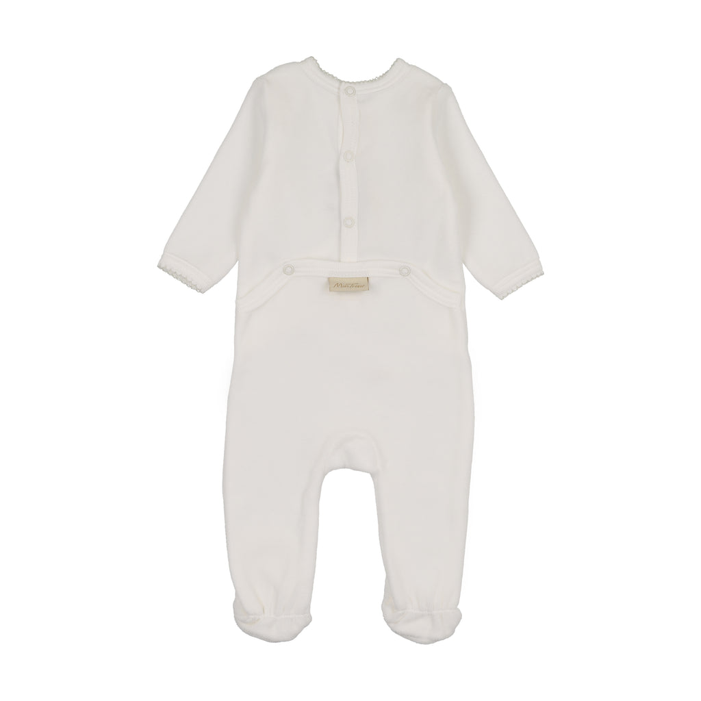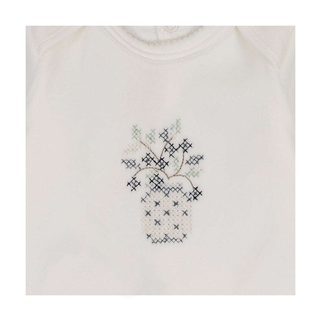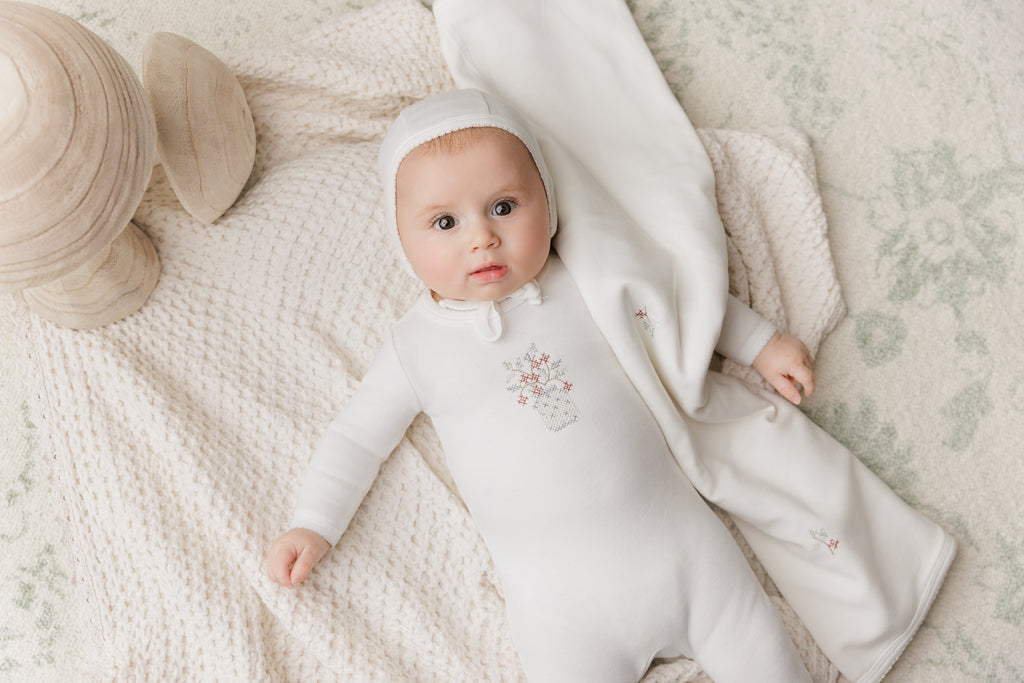 Intricate cross-stitch embroidery of a vase filled with berries and leaves on the chest, blending elegance with a touch of nature. The matching hat and blanket showcase a scattered berry print, tying the set together beautifully.