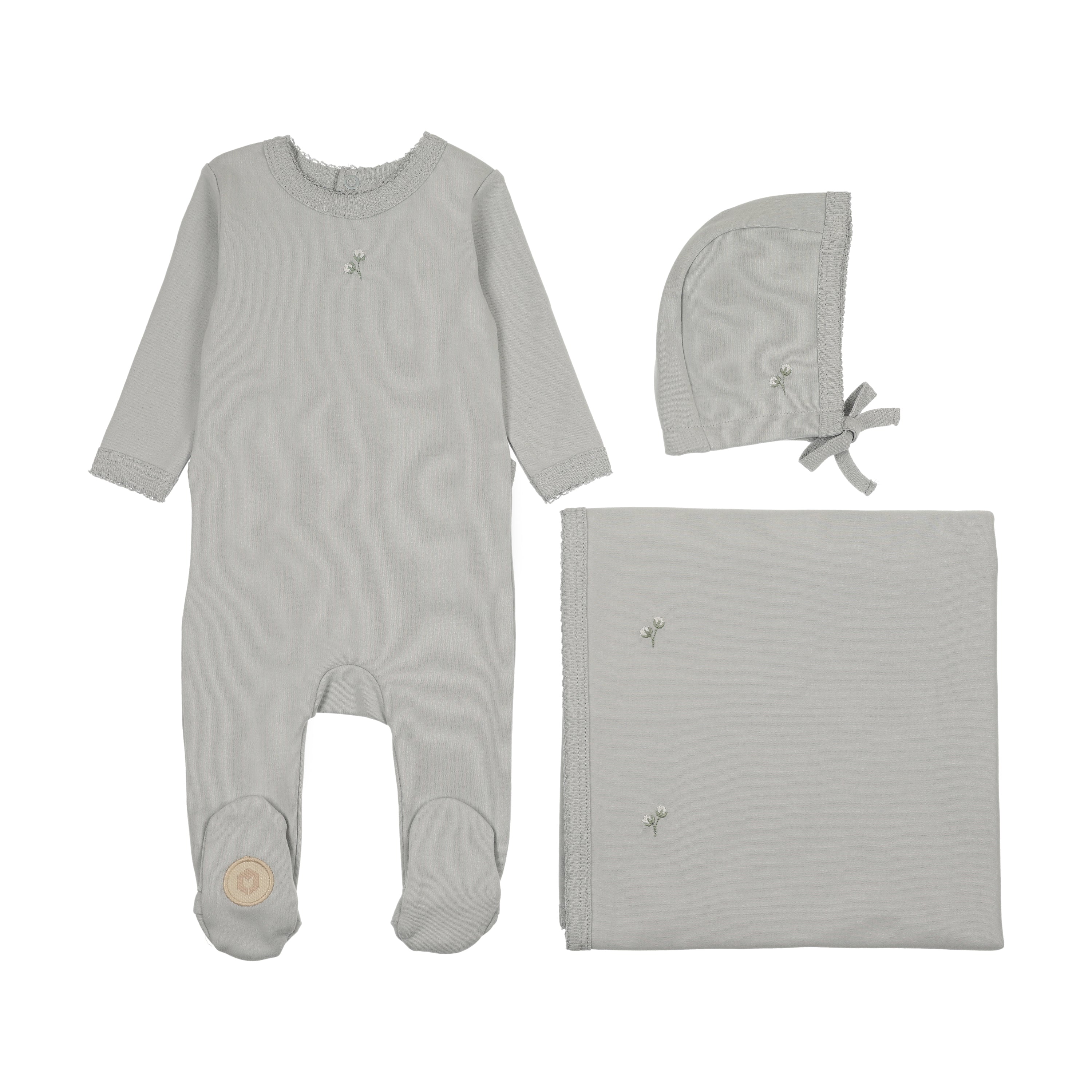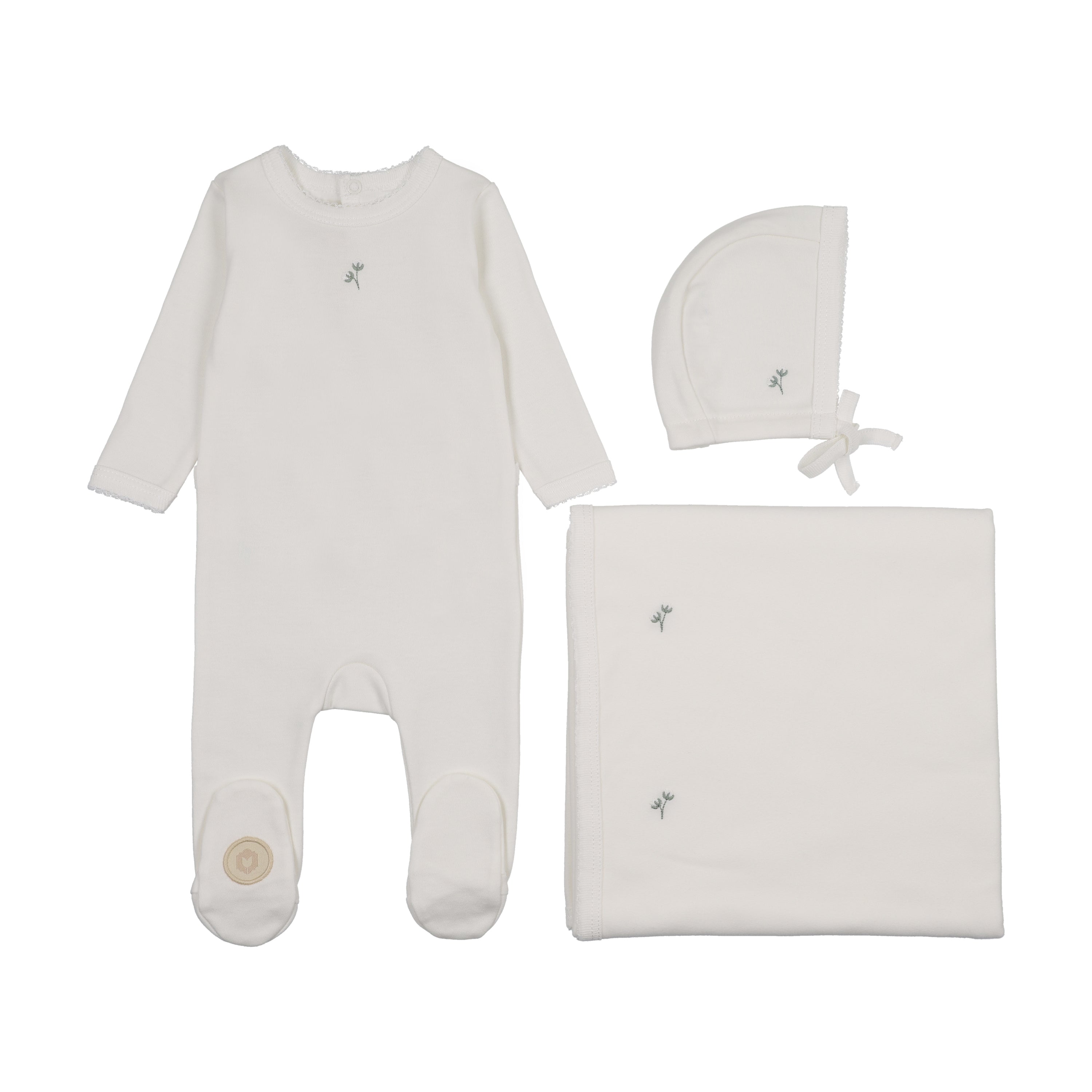 A delicate knit wrap cardigan overlay creates a layered look that's both stylish and cozy. Tiny flower or shrub embroidery on the chest peeks out when the cardigan is worn. The same charming embroidery appears on the matching hat and blanket, tying the whole set together in a beautiful, coordinated way. Please note, this is for the layette set only without the cardigan.