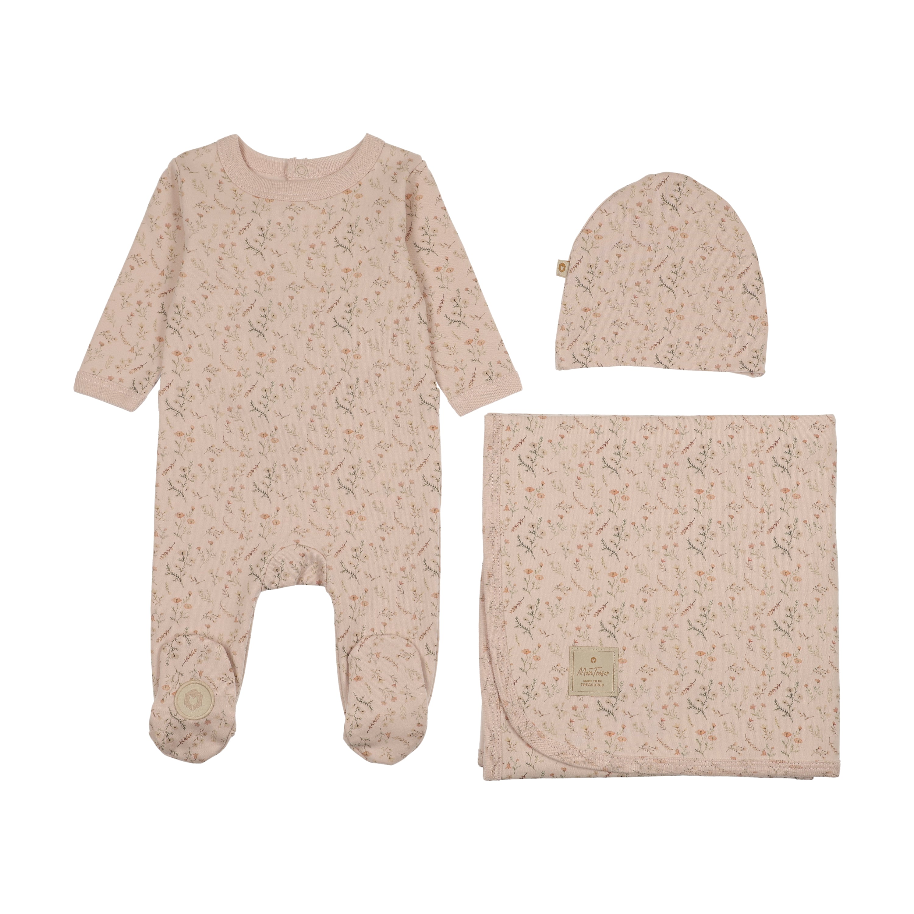 Fully floral footie in brushed cotton? Yes, please! Vibrant-yet-tiny blooms cover the entire footie, creating a cozy, eye-catching look. Paired with a matching floral hat and blanket, this set is as sweet as it is snuggly.