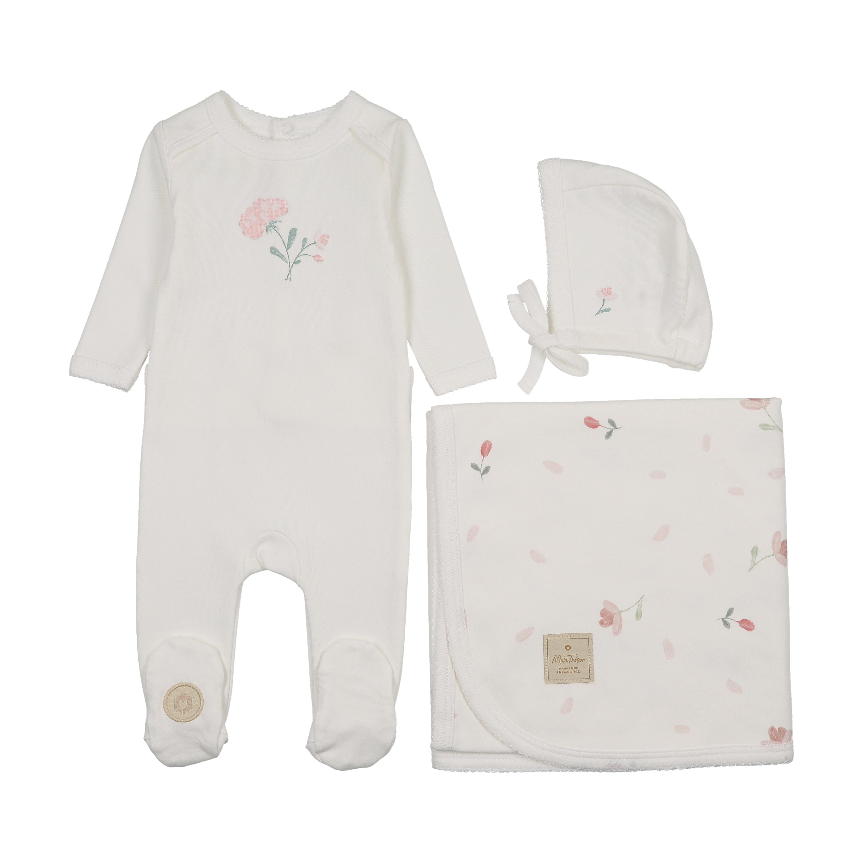 Footie set with printed florals and a hand-painted look. Blue-hued or pink petals. Matching blanket with all-over floral print, and bonnet with floral accent. Too charming to resist!