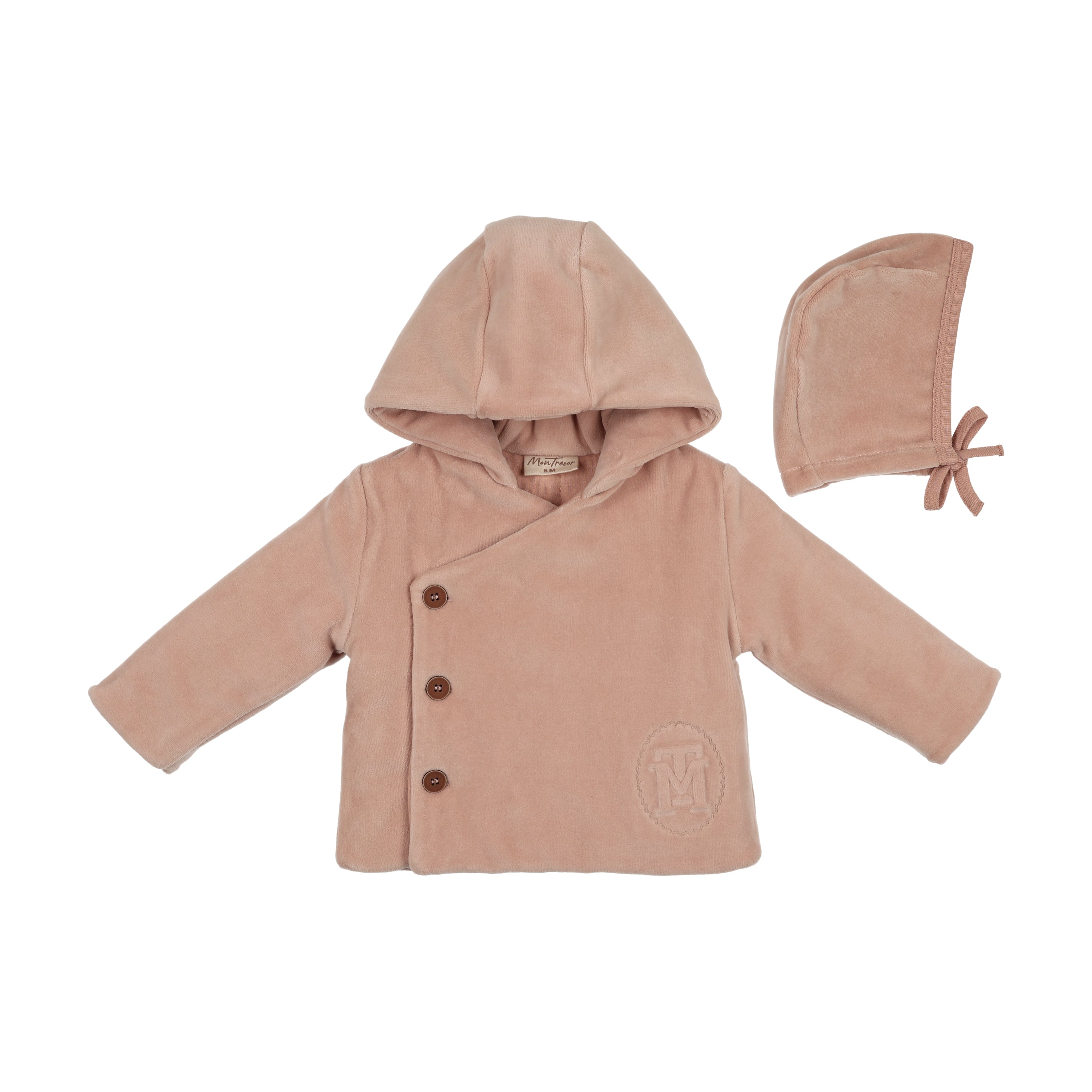 Too touchable! This velour jacket is designed in an easy wrap style for a snug fit. Complete with a cozy hood and the embossed MT emblem on the side, it's a perfect match to the ribbed velour footie.