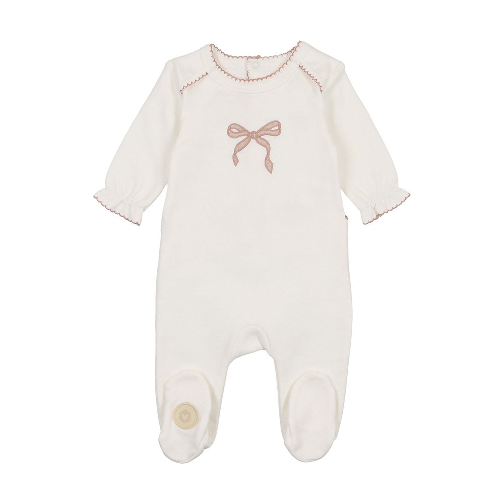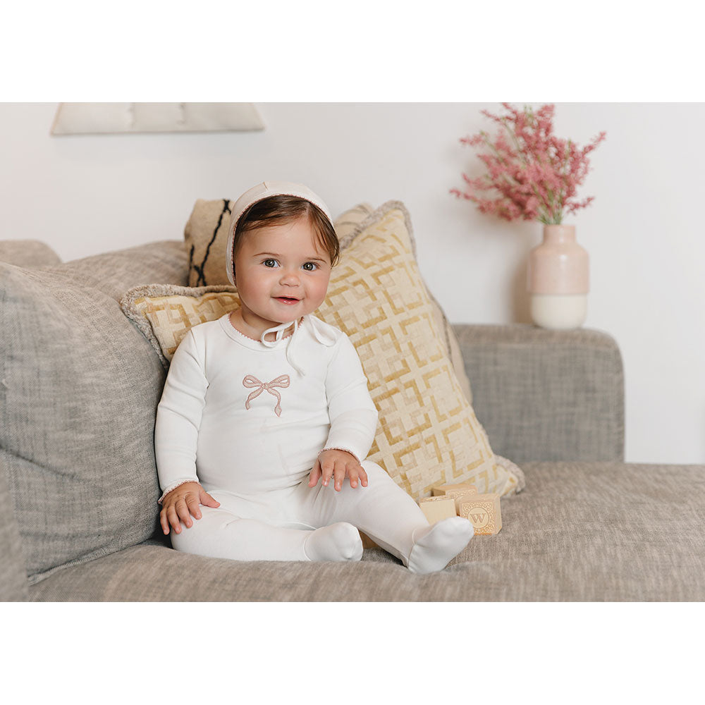 A delicately embroidered pink bow and fine collar trim create understated elegance on this cotton footie.