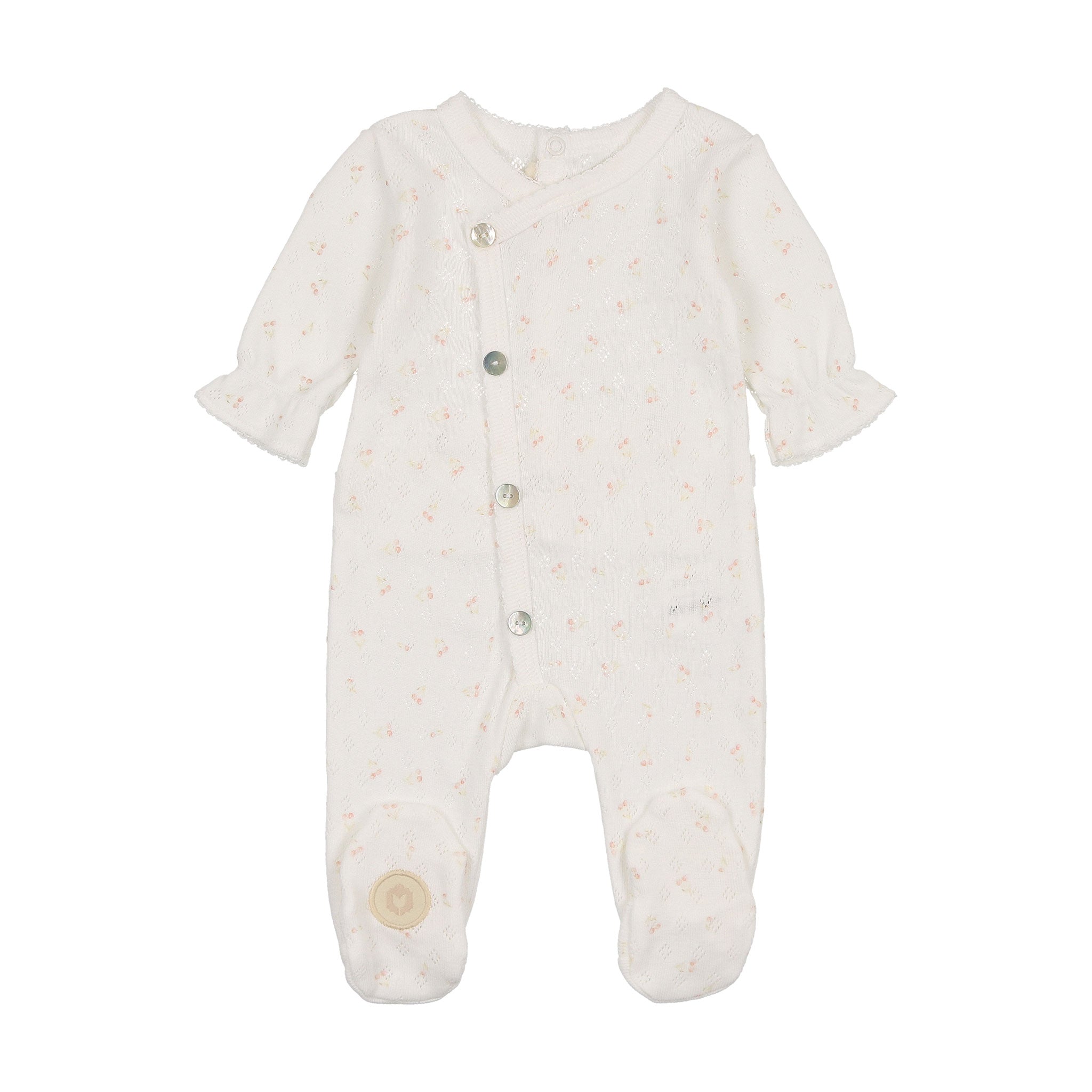 Crafted with lightweight pointelle cotton, this cozy wrap footie is scattered with a delicate cherry print. A thin ribbon trim and decorative buttons add the perfect finishing touches.