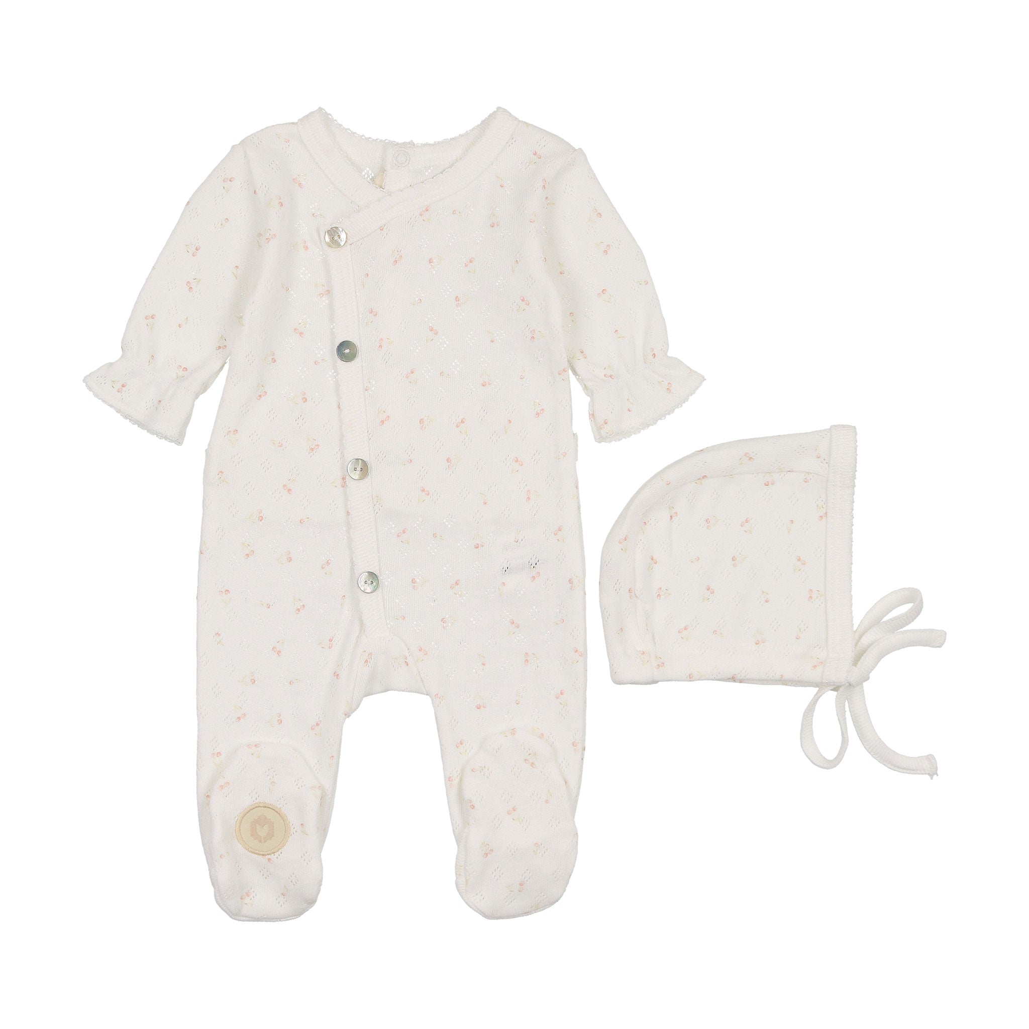 Crafted with lightweight pointelle cotton, this cozy wrap footie features a delicate cherry print. A thin ribbon trim and decorative buttons add the perfect finishing touches.