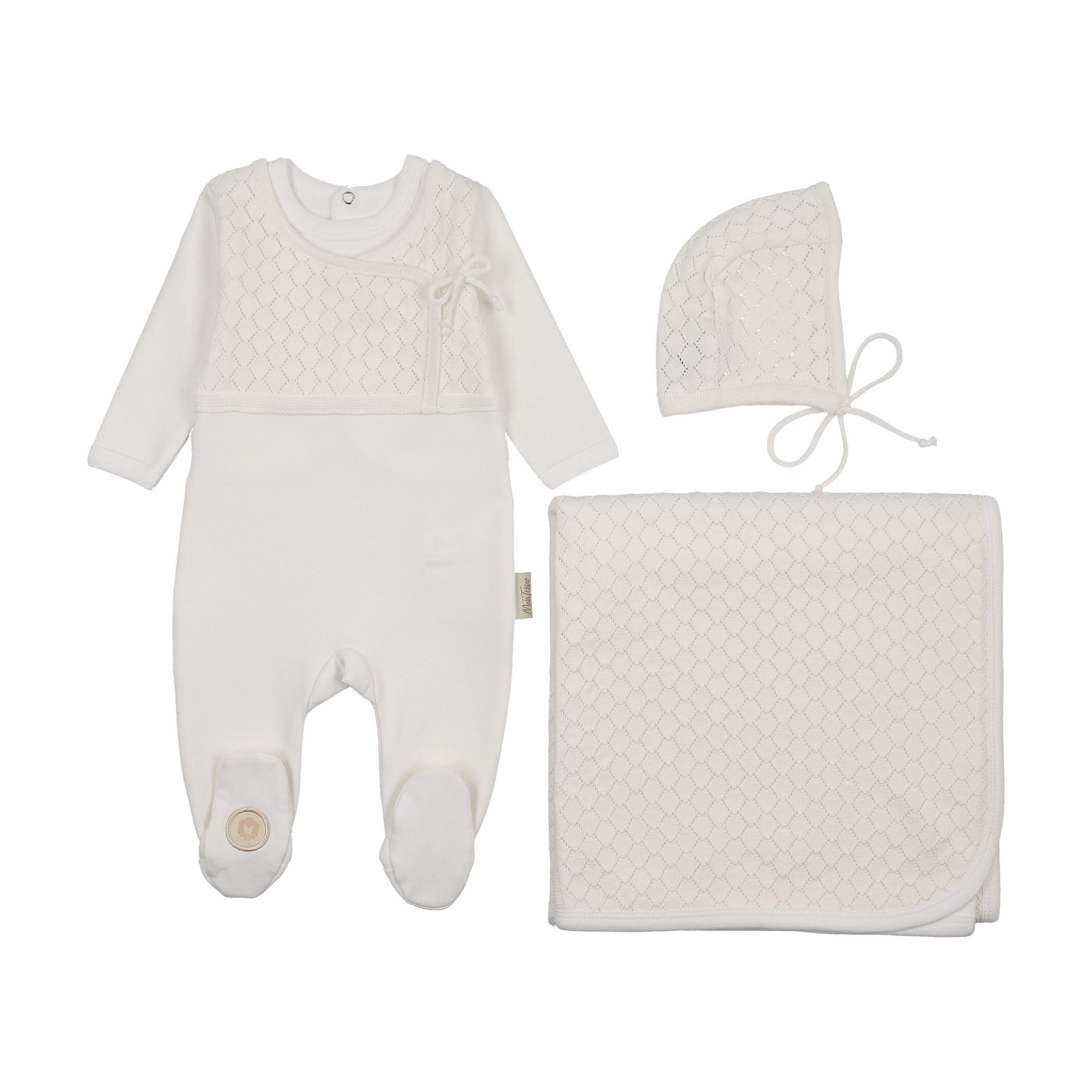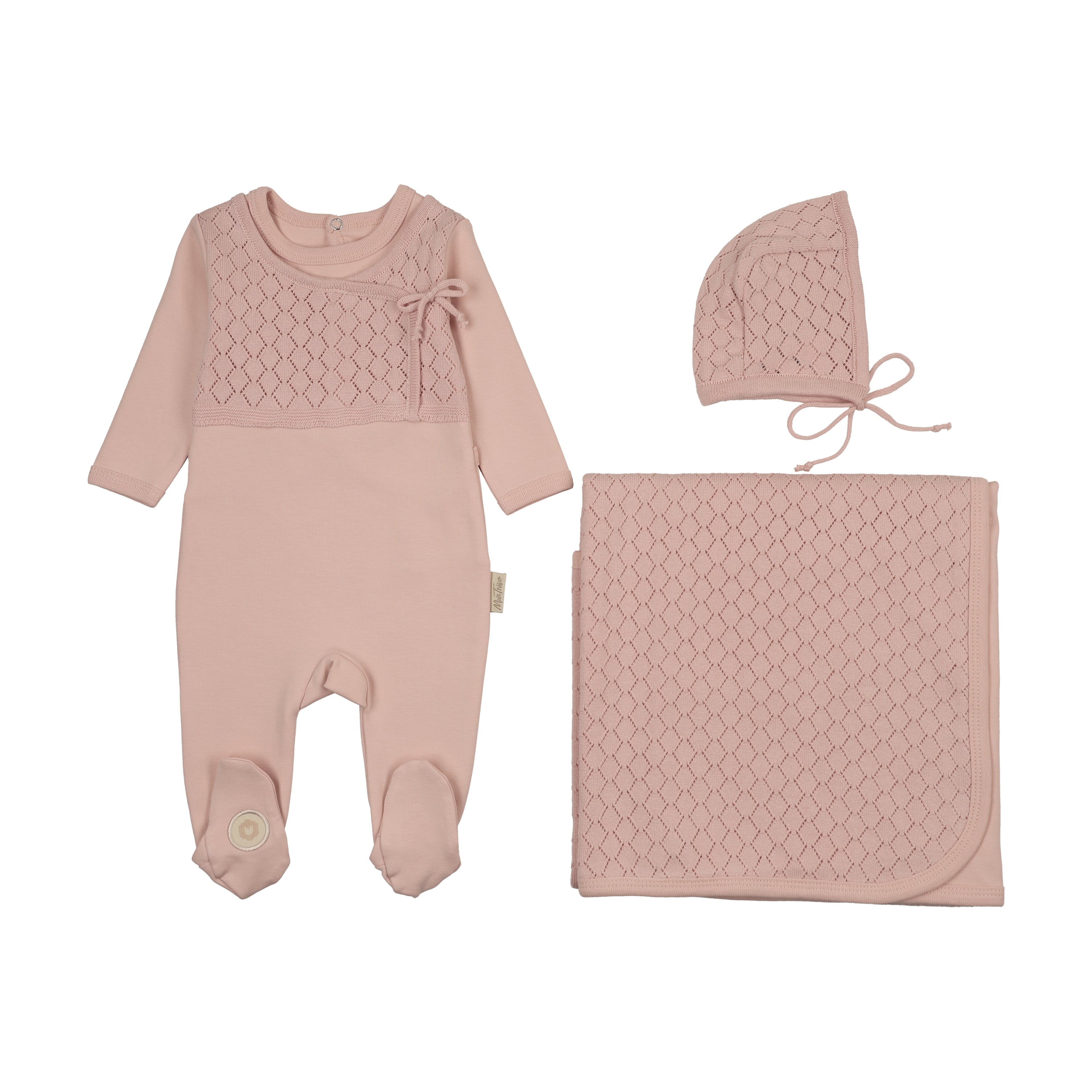 Wrap your little one in cozy charm! Includes delicate knitted pointelle overlay on a soft cotton footie, a snug pointelle knit hat, and a coordinating knit and cotton blanket.