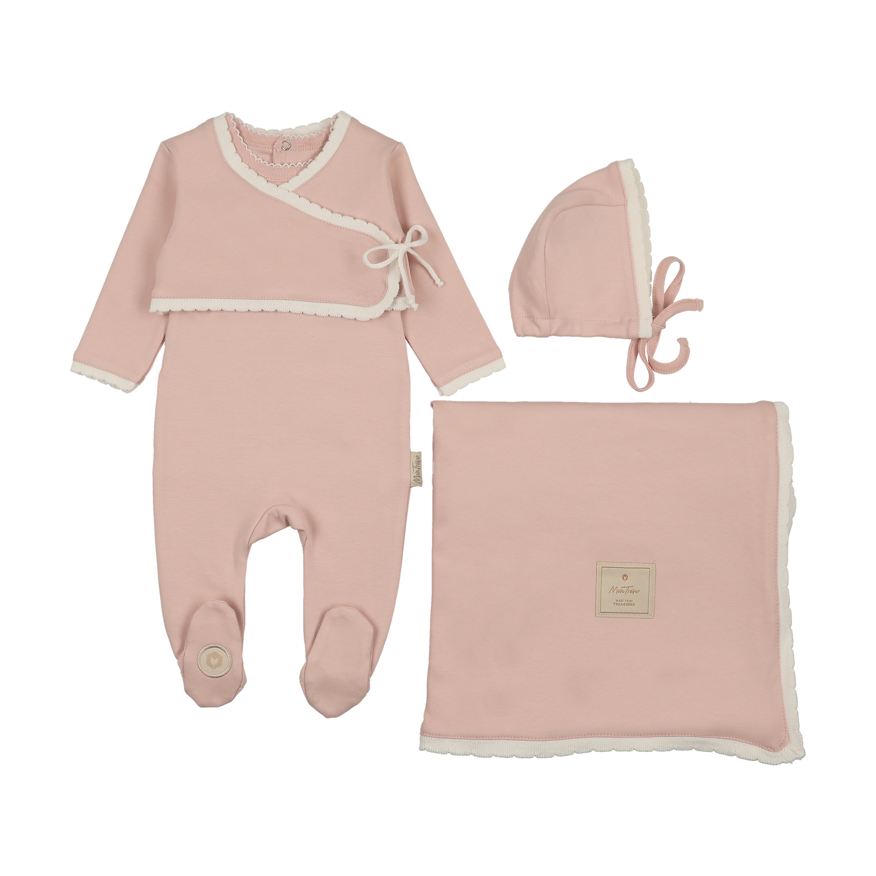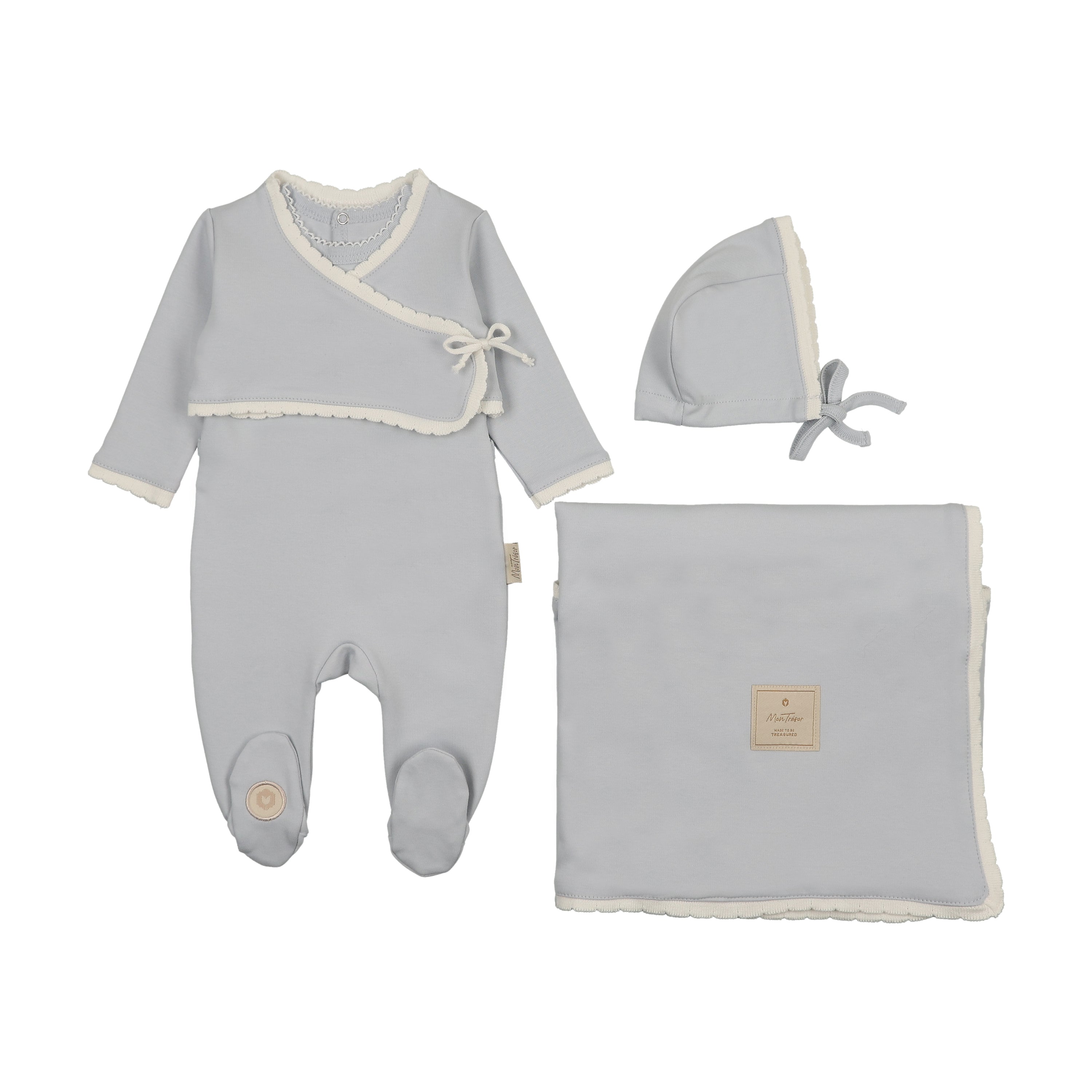 Includes cotton wrap cardigan, sleeveless footie, bonnet and blanket. Touched with delightful detail like knitted scalloped trim, and knitted tie strings.