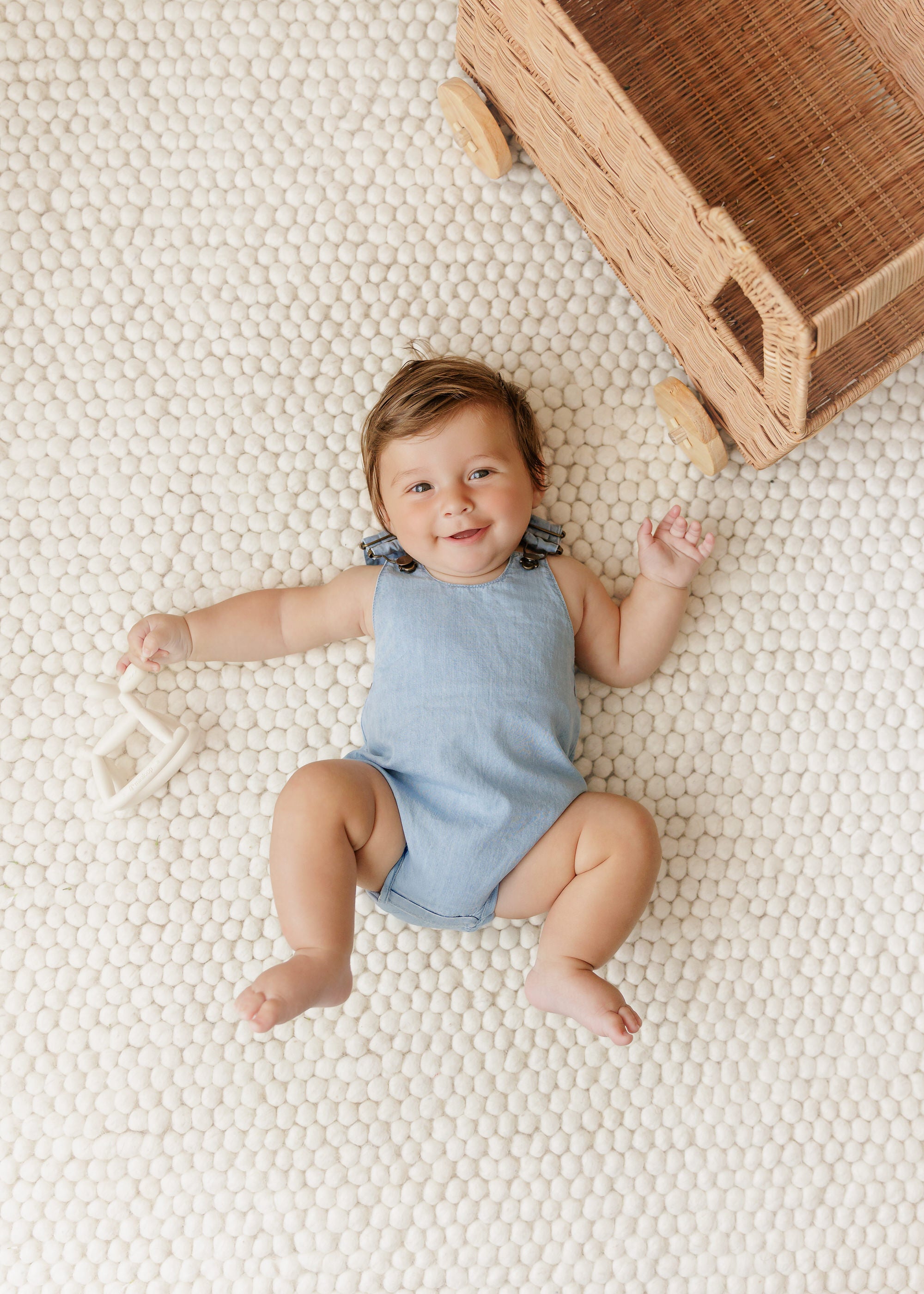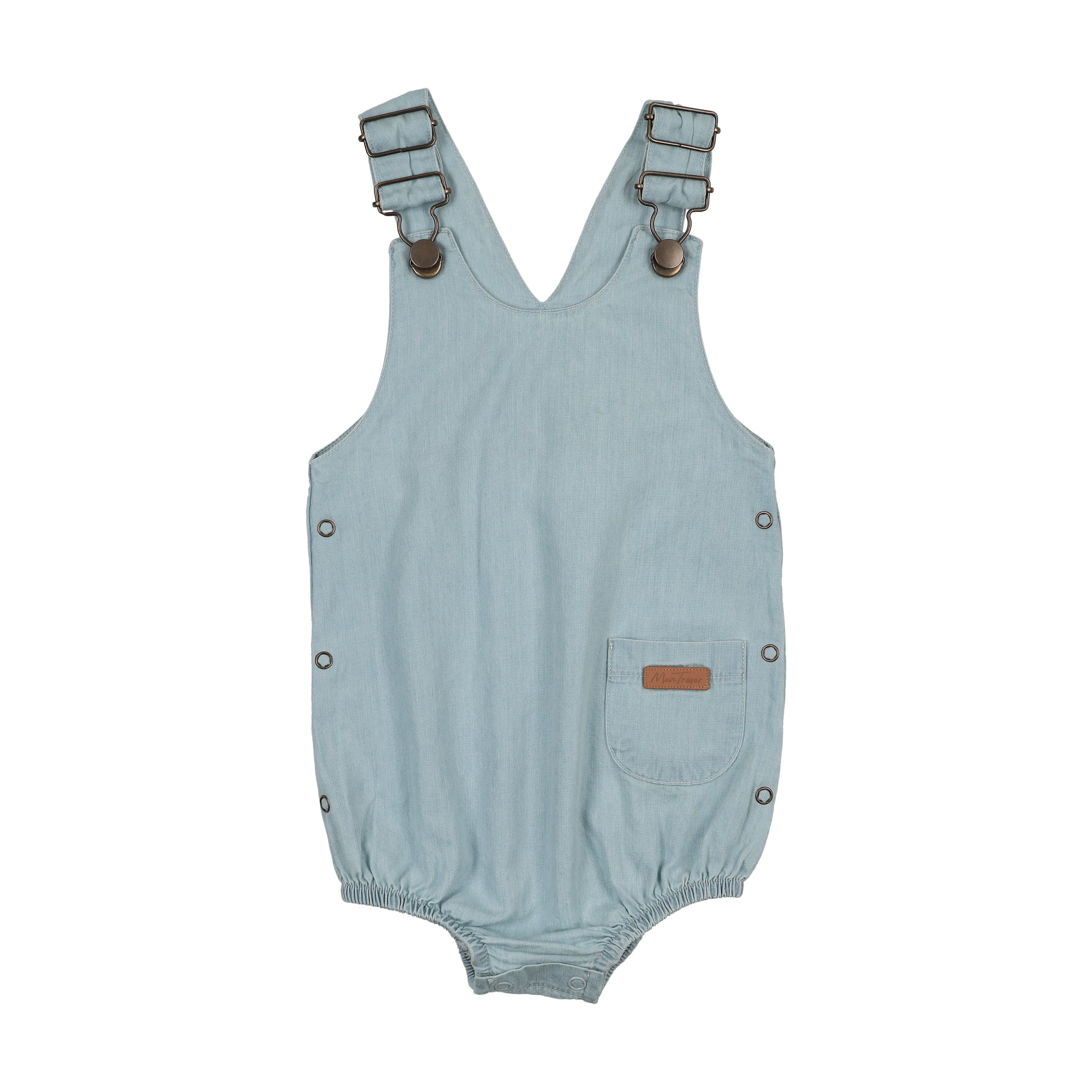 The “Ohmigosh must have it” denim romper. Flaunts durable metal hardware and side-seam snaps for easy changes. Adorable back pocket features leather embossed Mon Tresor label and metal snap accents.