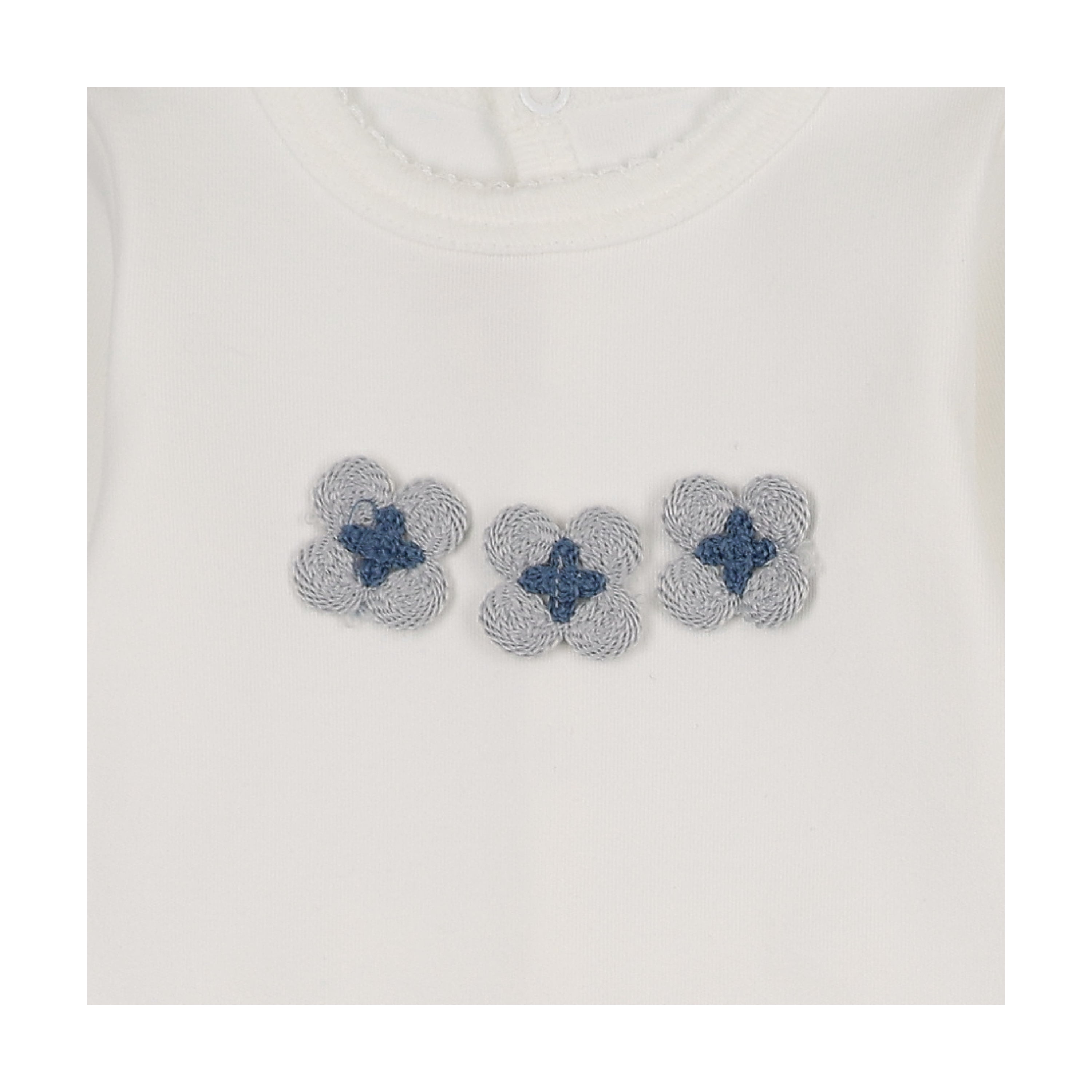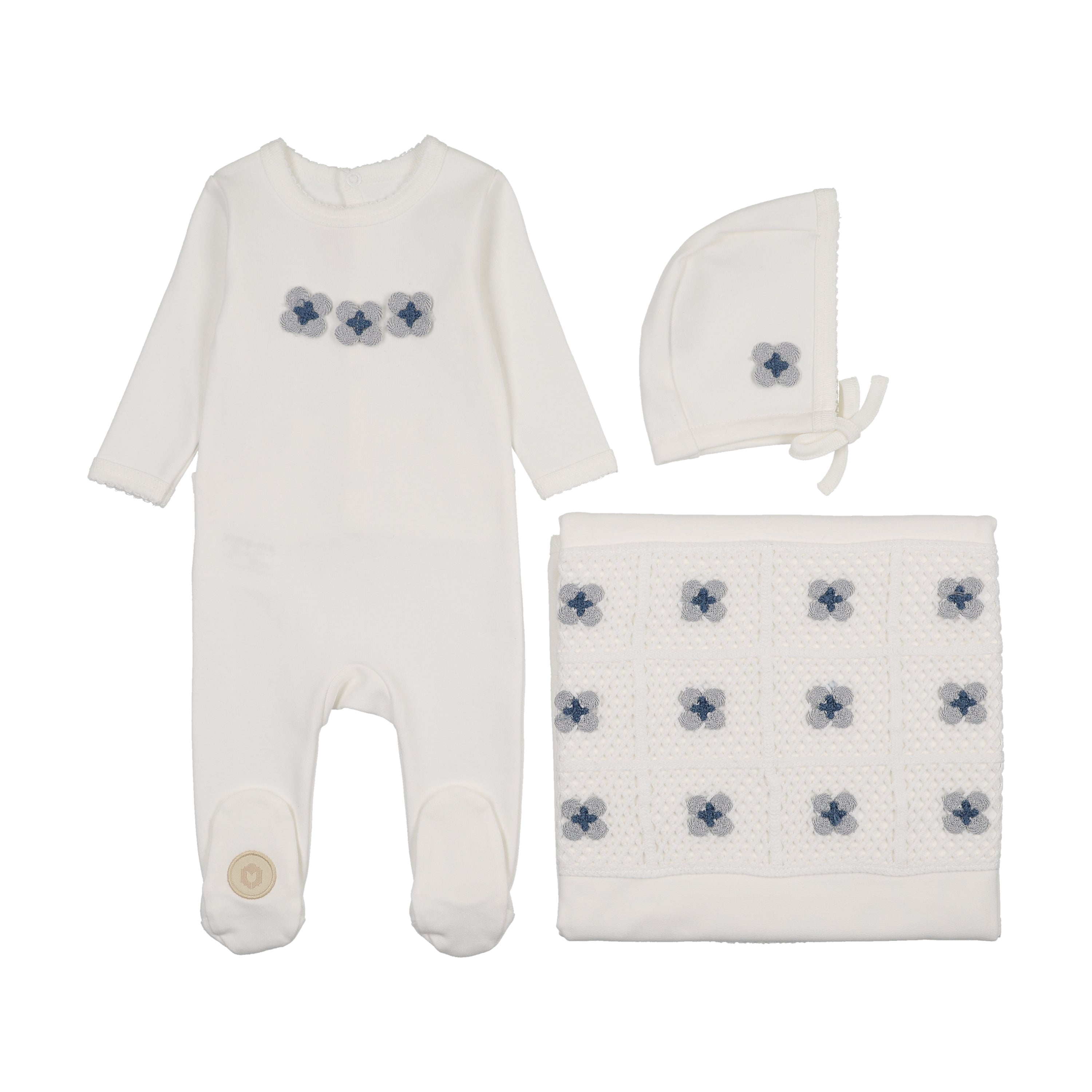 Cotton footie, hat, & blanket featuring charming crochet, three dimensional geometric flowers and scalloped trim for a touch of bliss.