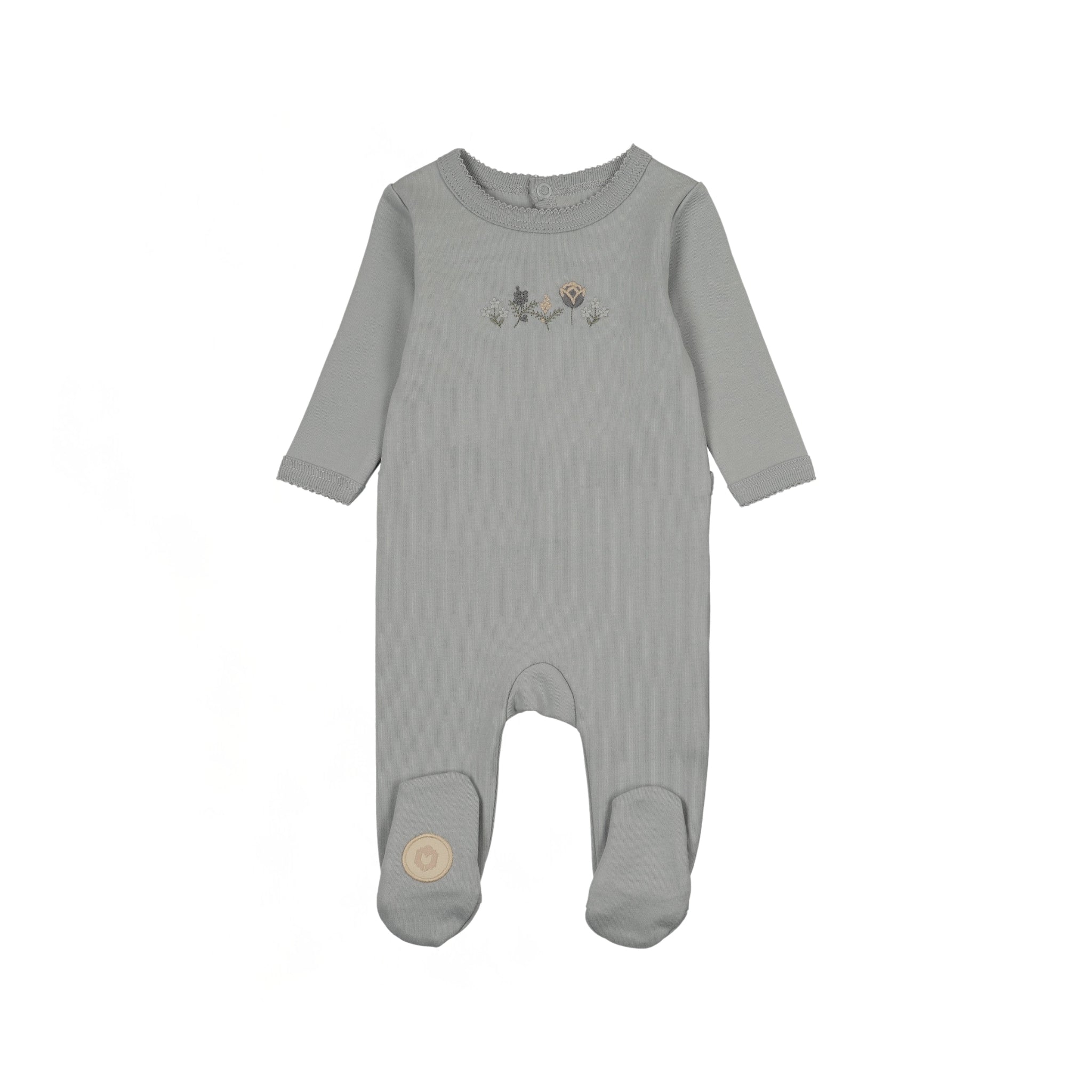 Buttersoft cotton footie featuring floral embroidery on chest and scalloped trims. Includes hat and blanket with coordinating all-over floral print.