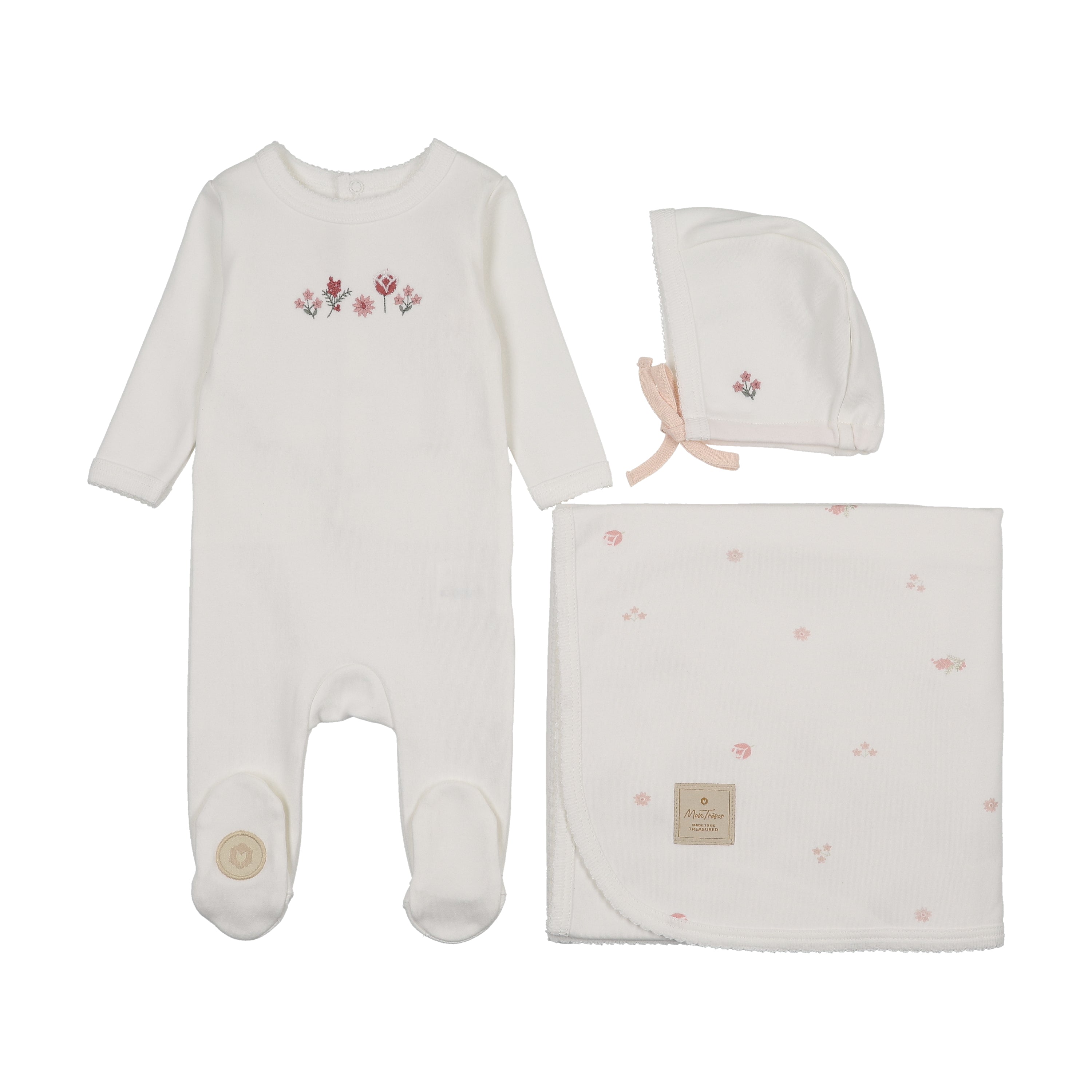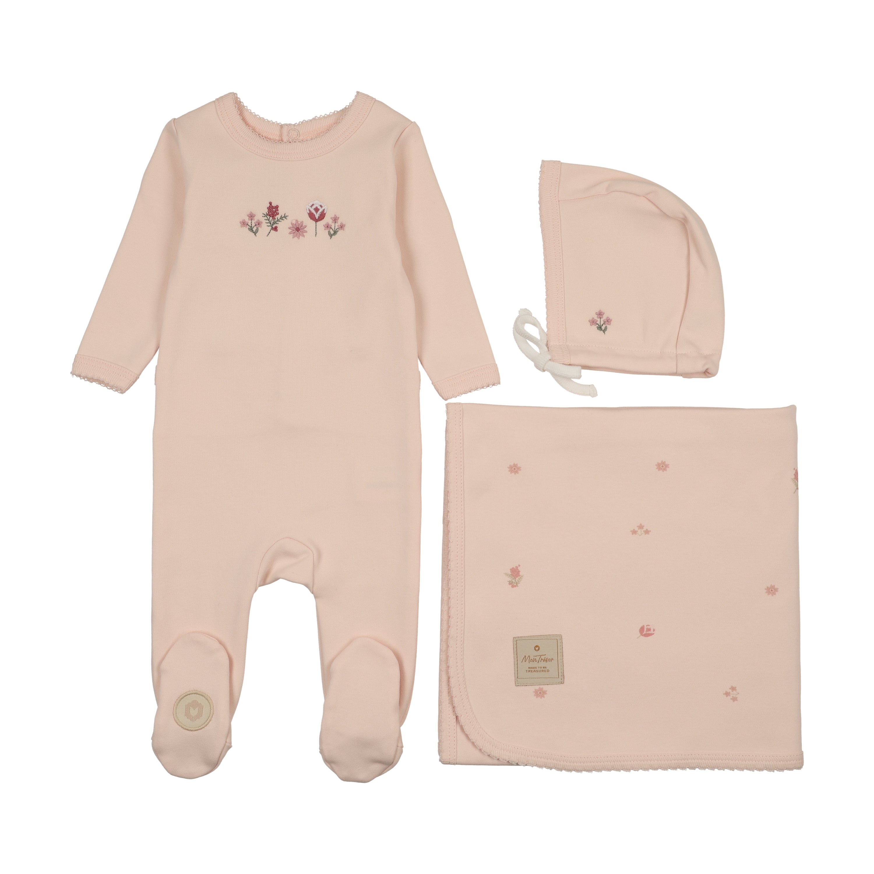 Buttersoft cotton footie featuring floral embroidery on chest and scalloped trims. Includes hat and blanket with coordinating all-over floral print.