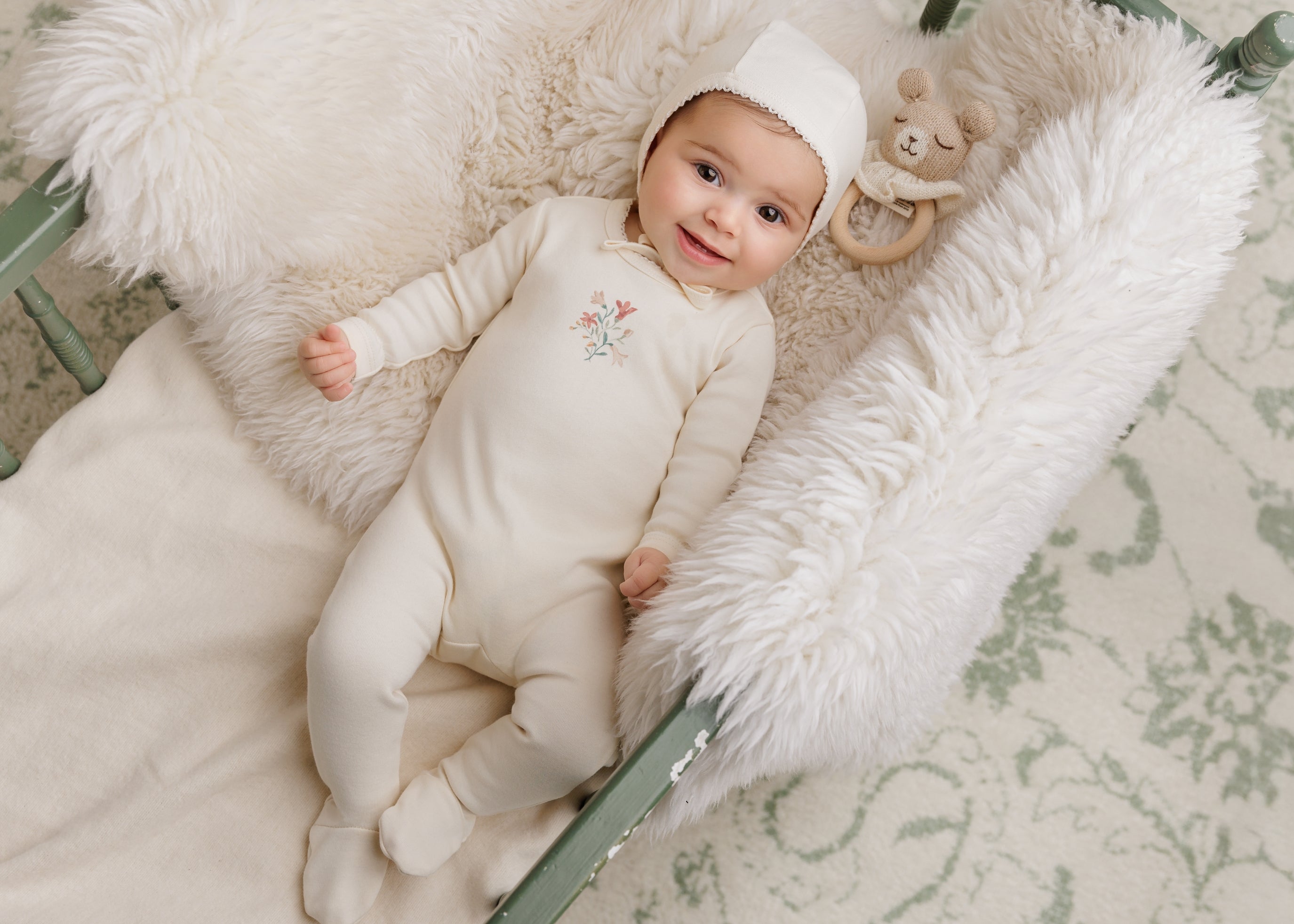 Cozy cotton footie featuring a charming floral print on the chest, bringing a whimsical, nature-inspired touch to your little one’s wardrobe. The coordinating blanket, with a border of flowers and blooms, completes the set with a sweet, floral vibe.