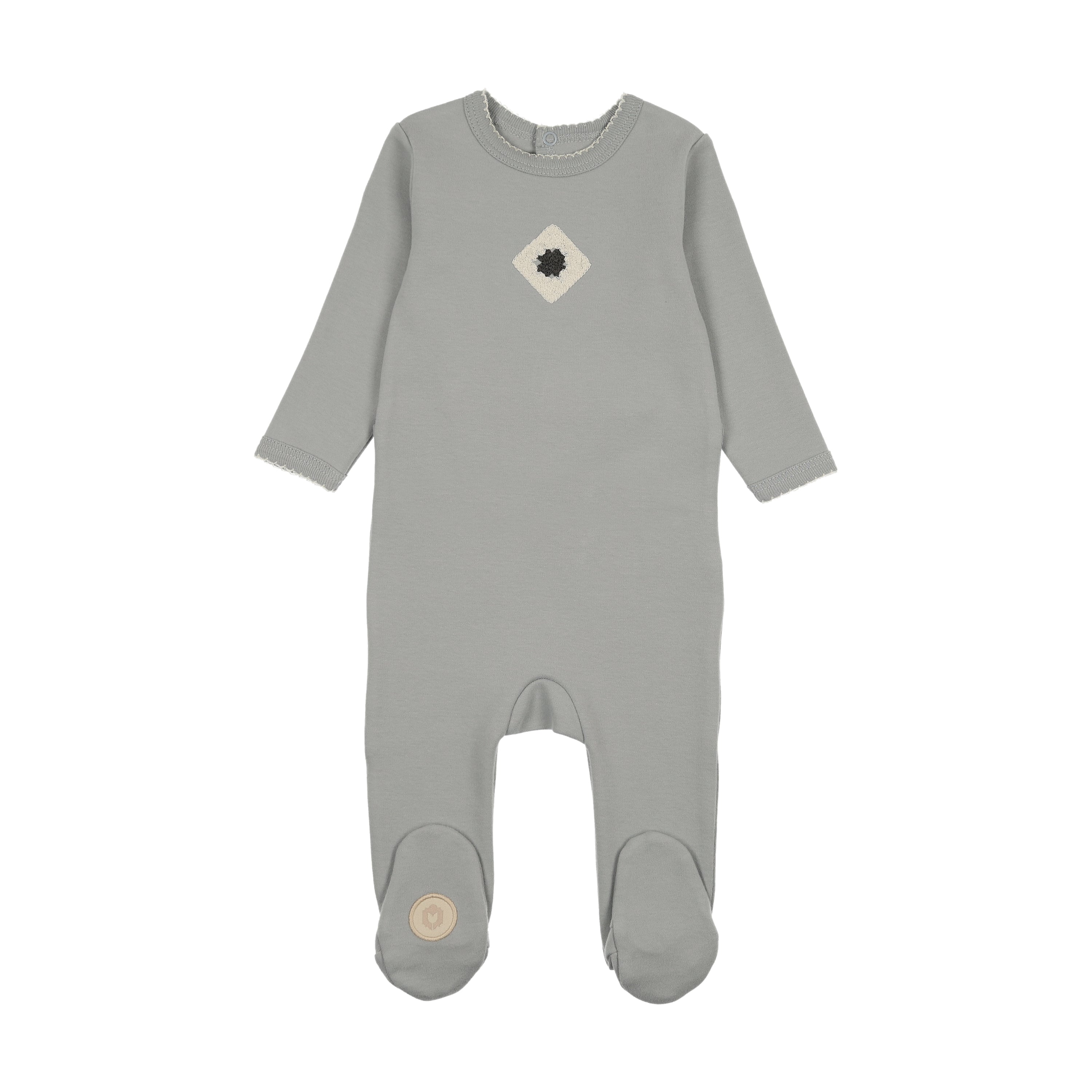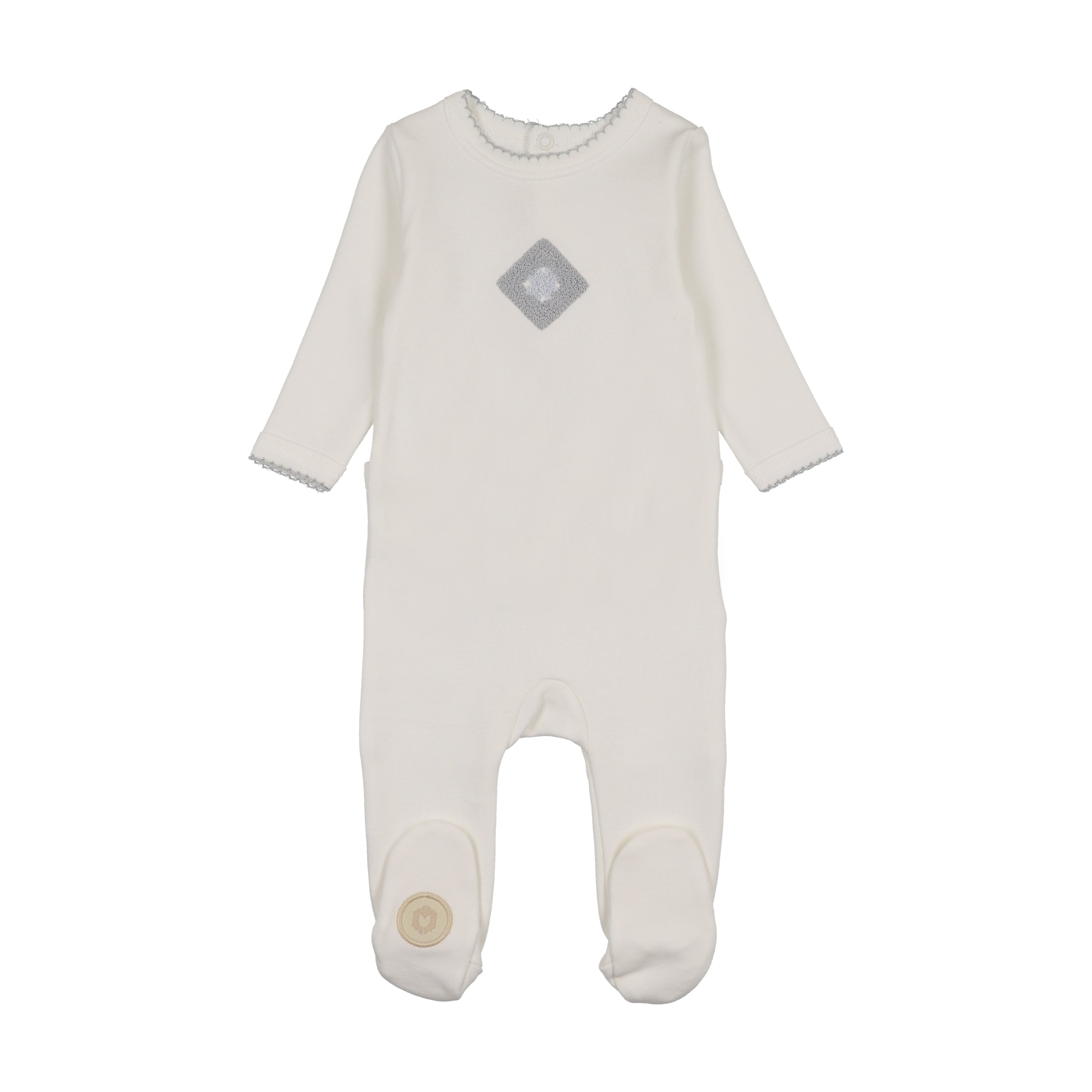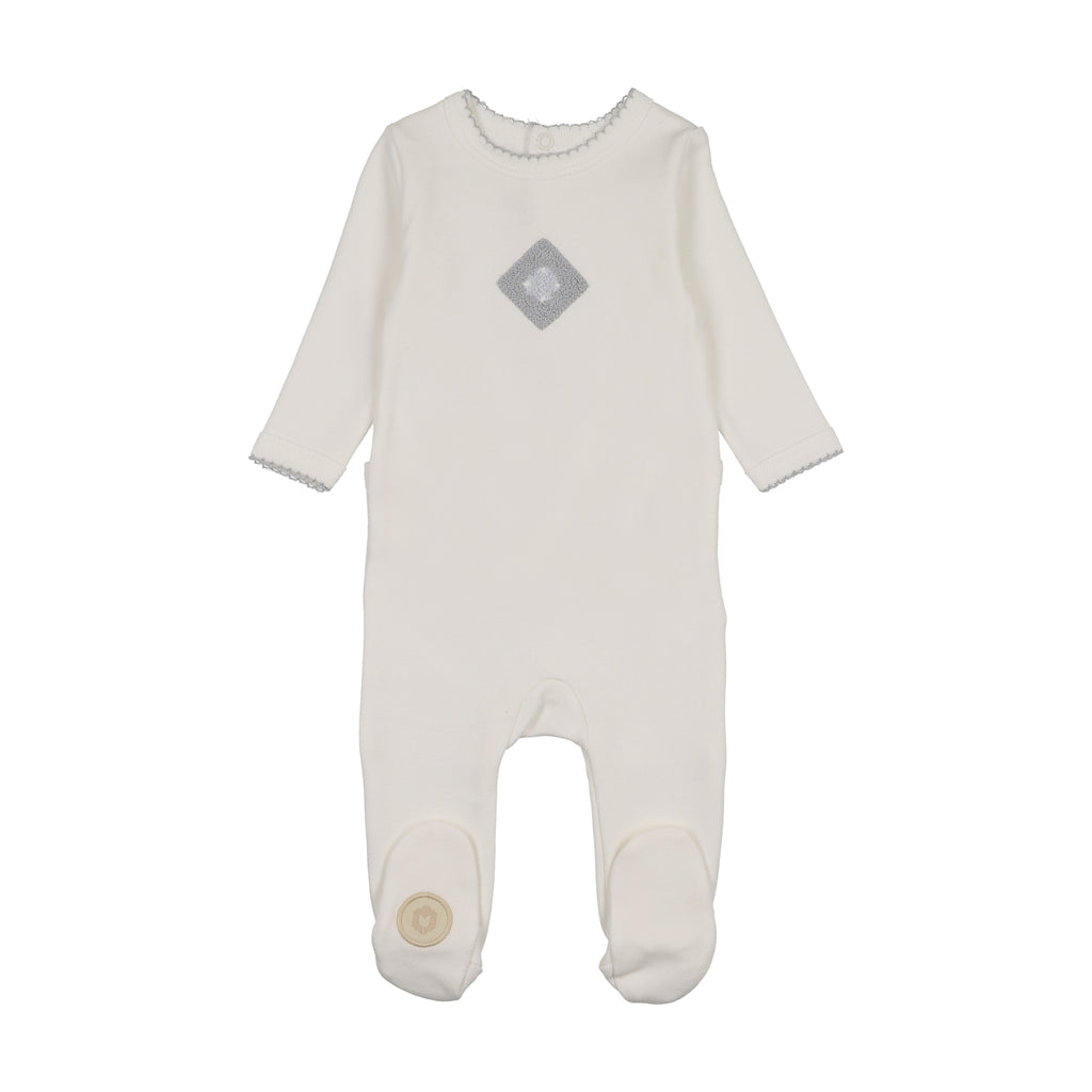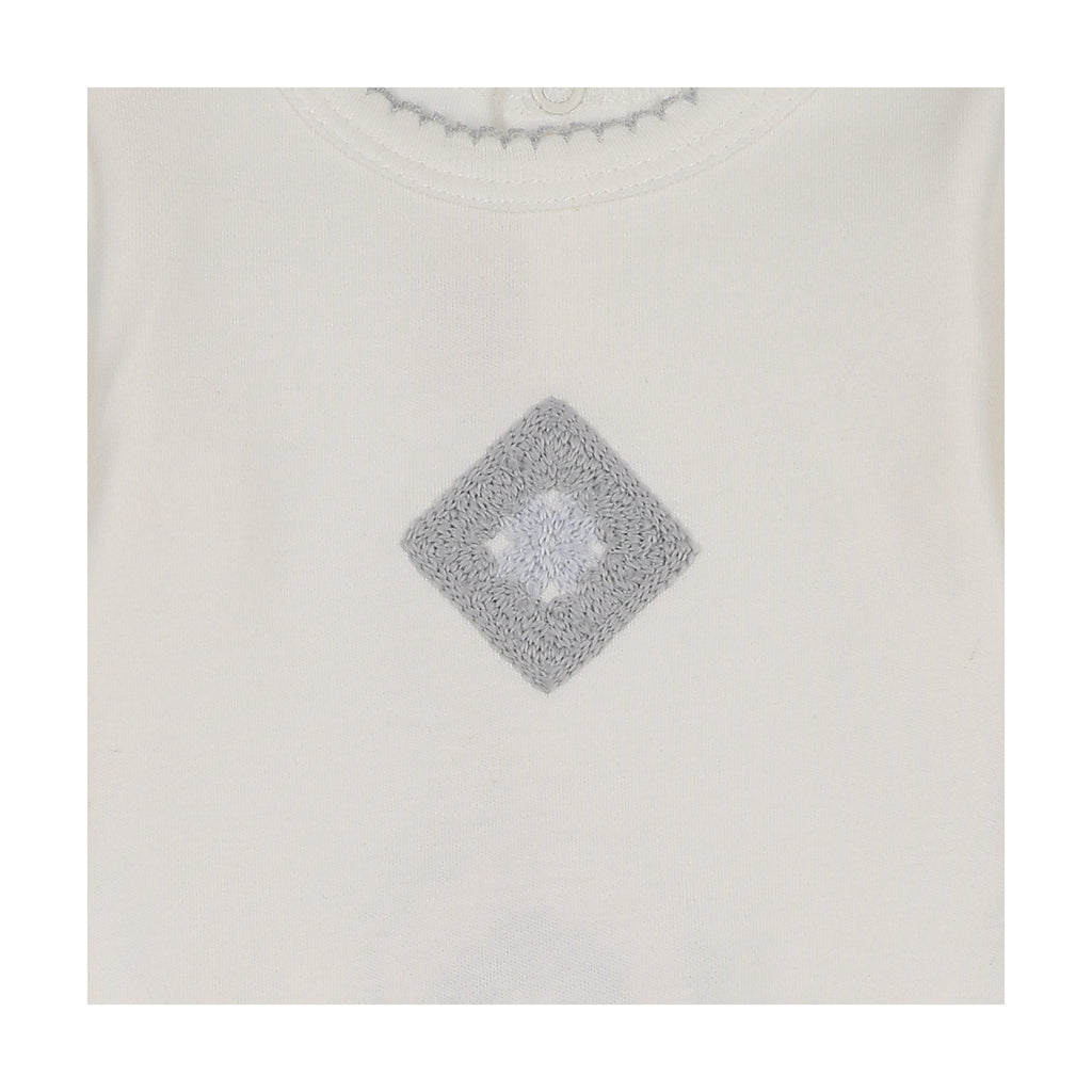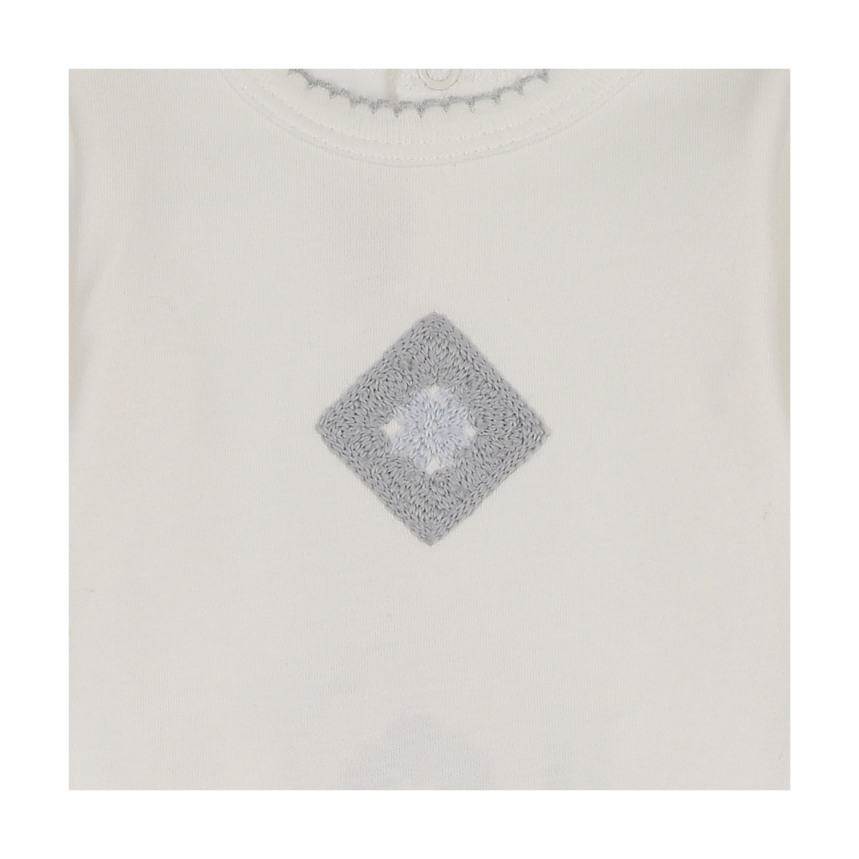 Do well in geometry this season. This uniquely blissful cotton footie is adorned with a charming knit flower and geometric shape appliqué on the chest. Here's a modern twist on timeless design. Paired with a beautifully knit blanket featuring matching geometric shapes and a coordinating hat.