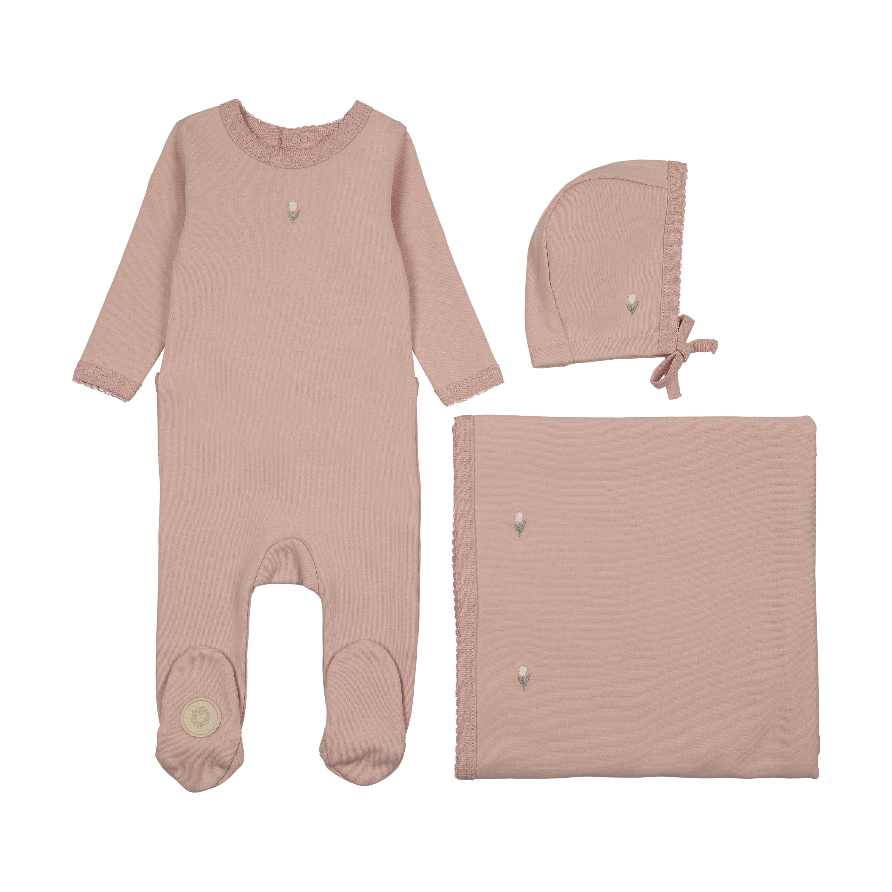 A delicate knit wrap cardigan overlay creates a layered look that's both stylish and cozy. Tiny flower or shrub embroidery on the chest peeks out when the cardigan is worn. The same charming embroidery appears on the matching hat and blanket, tying the whole set together in a beautiful, coordinated way. Please note, this is for the layette set only without the cardigan.