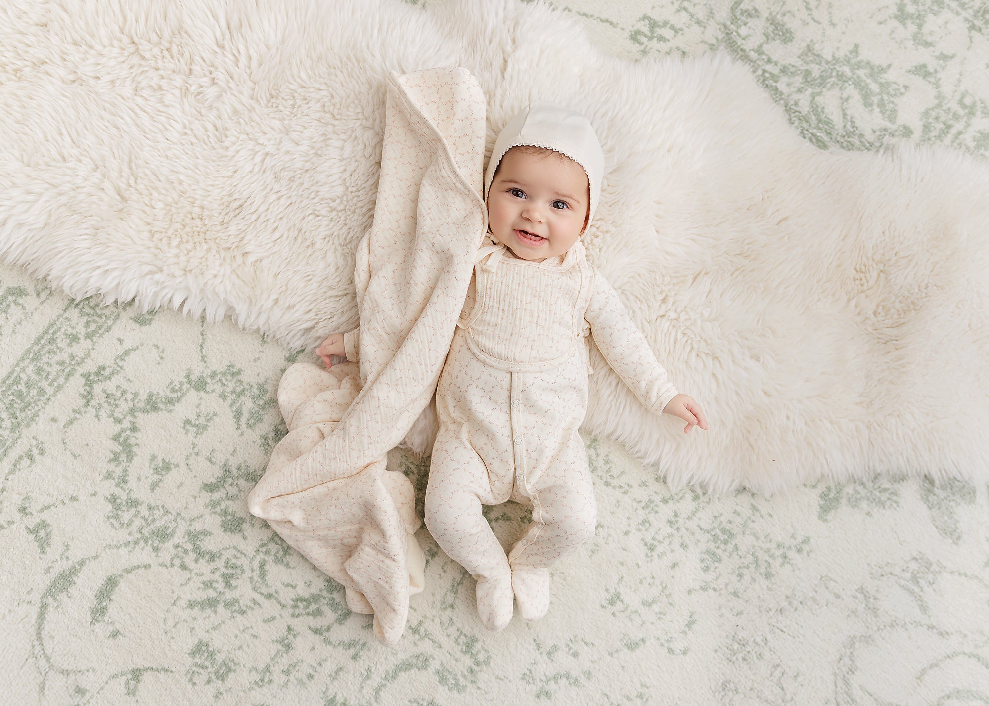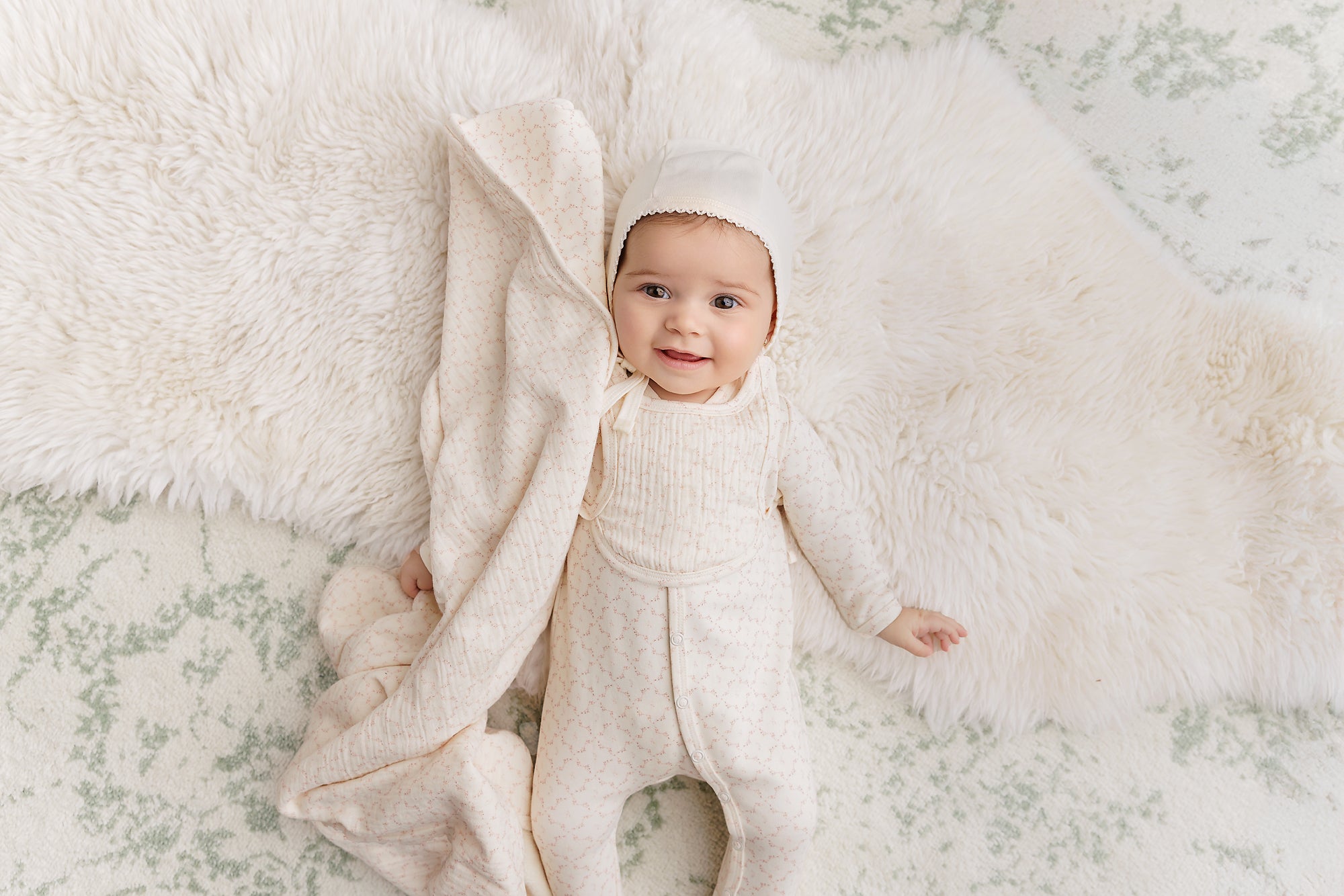 Soft cotton meets fresh geometric style in this perfectly coordinated set. Featuring an allover floral-inspired geometric print with a matching hat and blanket, each piece feels light, comfortable, and easy to wear. A sweet everyday essential with a modern edge.